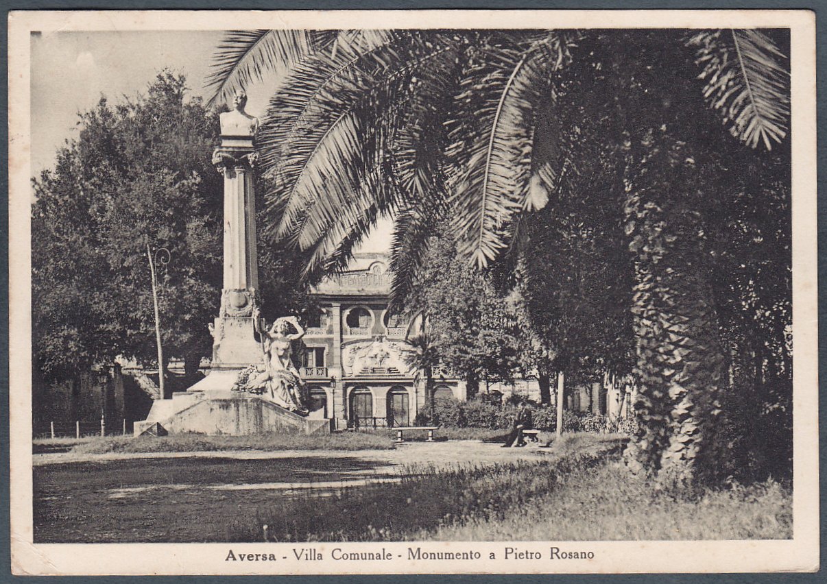 Cartolina d’epoca, Aversa Villa Comunale monumento a Pietro Rosano, anni ’30 (Civica Raccolta Pizzo, proprietà Salvatore Pizzo, curatrice Ester Pizzo)