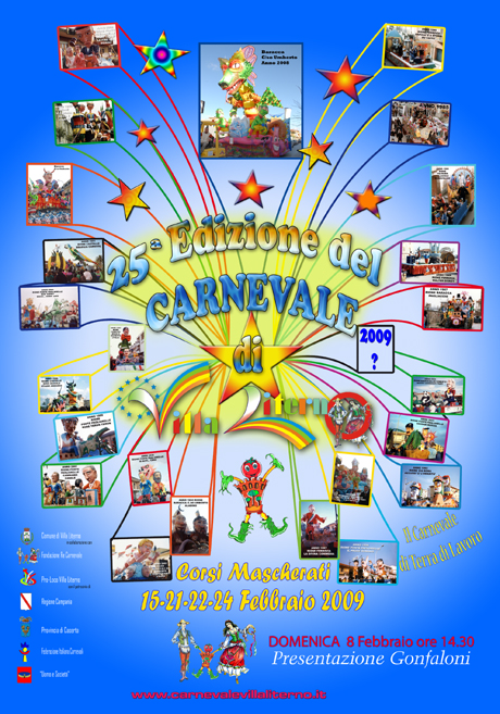 E’ stato presentato ufficialmente il manifesto della 25esima edizione del Carnevale di Villa Literno. La manifestazione simbolo di Terra di Lavoro ha raggiunto un quarto di secolo e per celebrare l’evento ha proposto un manifesto rievocativo della propria storia. La grafica, realizzata da Enzo Ucciero, che cura le immagini della manifestazione e l’aggiornamento del sito internet, è volutamente al servizio delle celebrazioni:nozze d’argento fra Re Carnevale e il popolo liternese, che lo ha eletto a sovrano incontrastato della terra dei Mazzoni. Un allegro “Pummarustiello”, maschera ufficiale della manifestazione, presenta al pubblico i carri allegorici che hanno trionfato alle edizioni precedenti. I carri allegorici sfileranno per le strade del paese domenica 15, sabato 21, domenica 22 e martedì 24 febbraio. Presentazione dei gonfaloni domenica 8. Due giorni prima, il venerdì sera, nella sala Splendore di piazza Marconi, circa 20 ragazze saranno in gara per il titolo di “Reginetta del Carnevale”. A presentare l’evento, come da tradizione, Alfredo Irace. Nello staff organizzativo Anna Chiaramonte, Angelica Russo, Raffaella Puca e Monica Cerullo. Le ragazze in concorso sfileranno in abiti casual, eleganti e infine con un costume da carnevale. Il concorso serve anche a selezionare le rappresentanti del Carnevale di Villa Literno per la finale nazionale che si terrà dopo martedì grasso a Viareggio.