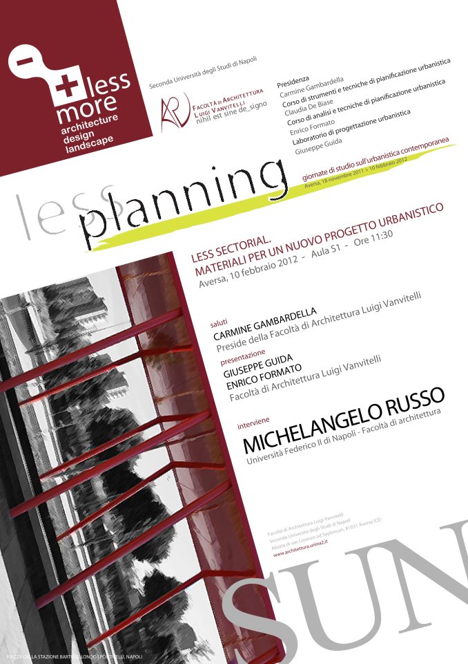 Si concluderà venerdì Less Planning, il ciclo di seminari sull’urbanistica in corso nella Facoltà di Architettura di Aversa. Un appassionante percorso in-formativo che da un mese sta raccontando, attraverso ospiti d’eccezione, problematiche, dinamiche e metodologie d’intervento di una disciplina complessa e multisfaccettata. Una materia in continua evoluzione, che è costretta a fare i conti con le scomode implicazioni politiche, i veloci cambiamenti sociali, le incongruenze normative ed un territorio fin troppo antropizzato. Teorie e metodi esecutivi differenti, esposti da architetti, urbanisti e pianificatori operanti in tutta Italia e all’estero. Si sono susseguiti in questo ciclo: Laura Lieto, Paolo Scattoni, Massimo Santoro, Mosè Ricci, Francesco Gastaldi, Leonardo Benevolo, Luigi Benevolo e Paola Viganò. La facoltà aversana, divenuta ormai da anni fertile luogo di scambio, accoglierà venerdì 10 febbraio 2012 alle ore 11:30, Michelangelo Russo, l’ultimo protagonista in ordine temporale di questo ricco percorso culturale.