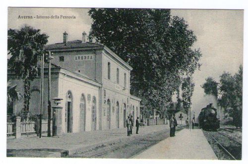 Cartolina di Aversa risalente alla prima decade del ‘900, quando la stazione ferroviaria era nel punto in cui adesso sorge il Liceo Scientifico, in Via Enrico Fermi.