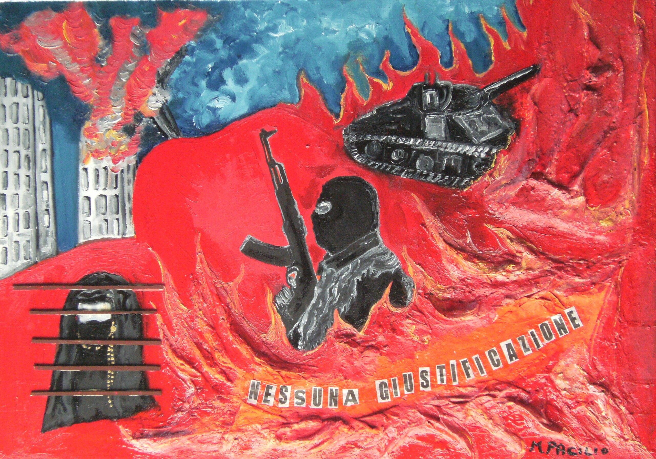 Mostra collettiva contemporanea: “Nessuna giustificazione alla violenza del terrorismo”. Iniziativa di trenta artisti che attraverso le loro opere, vogliono trasmettere un accorato messaggio contro il terrorismo ed ogni forma di violenza fisica e psicologica. La manifestazione è patrocinata dal Comune di Giugliano. Gli organizzatori hanno fatto sapere che la mostra avrà seguito il dal 2 ottobre alle ore 17,30 alla Galleria Gamen sita in via Pontenuovo 26 Napoli. Nella serata di sabato gli ospiti d’ onore saranno: Marilena Mercogliano (Critica d’arte); Amedeo Laboccetta (deputato); Luigi Guarino (Presidente del Consiglio comunale di Giugliano in Campania); Margherita Ricci (autrice). Nel corso della serata ci sarà la testimonianza di una madre il cui figlio è stato vittima del “Terrorismo”