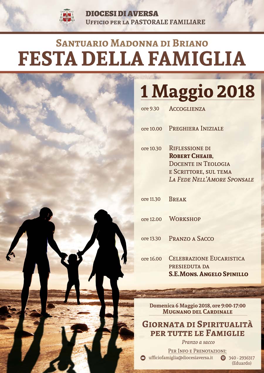 Il primo maggio è la giornata tradizionalmente dedicata alla “Festa della Famiglia” nella diocesi di Aversa. Una giornata di festa, ma anche di riflessione e confronto su questioni generali, ma pienamente calate nell’attualità. La diciassettesima edizione, organizzata dall’Ufficio Diocesano per la Pastorale Familiare, si svolgerà nell’ormai consueto e accogliente scenario del Santuario “Madonna di Briano” e vedrà l’illuminante partecipazione di Robert Cheaib, Docente in Teologia e Scrittore, che interverrà sul tema della “Fede Nell’Amore Sponsale”. La fede, dunque: in che modo le famiglie sono chiamate a trasmetterla alle nuove generazioni? Il confronto prenderà spunto dal tema dell’Anno Pastorale “Una generazione narra all’altra” e, commenta don Massimo Spina, “la relazione di Cheaib ci accompagnerà nella riflessione sulla trasmissione della fede nella realtà familiare, partendo dall’Amoris Laetitia”. “L’esortazione apostolica di Papa Francesco rappresenta un punto cardinale, una sorta di rivoluzione dell’amore. Vorrei sottolineare che l’incontro del primo maggio è aperto a tutti, riteniamo opportuno rivolgere un’attenzione anche a quelle famiglie ferite che vivono una particolare situazione di sofferenza tanto nel percorso di coppia quanto in quello individuale”, conclude il direttore dell’Ufficio per la Pastorale Familiare.