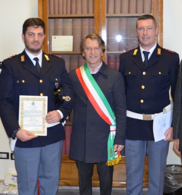 Il Sindaco di Aversa Enrico de Cristofaro ha consegnato un encomio solenne ai due agenti di polizia Michele Zingarelli e Giuseppe Iorio, che il 17 maggio dell’anno scorso si resero protagonisti di un coraggioso salvataggio di tre bambini. I due poliziotti intervennero in via Caruso per soccorrere una donna che era rimasta bloccata nell’auto in fiamme con tre bambini, richiamati dalle grida della giovane madre, i due agenti non esitarono ad affrontare le fiamme per trarre in salvo i tre piccoli, riportando una lieve intossicazione.