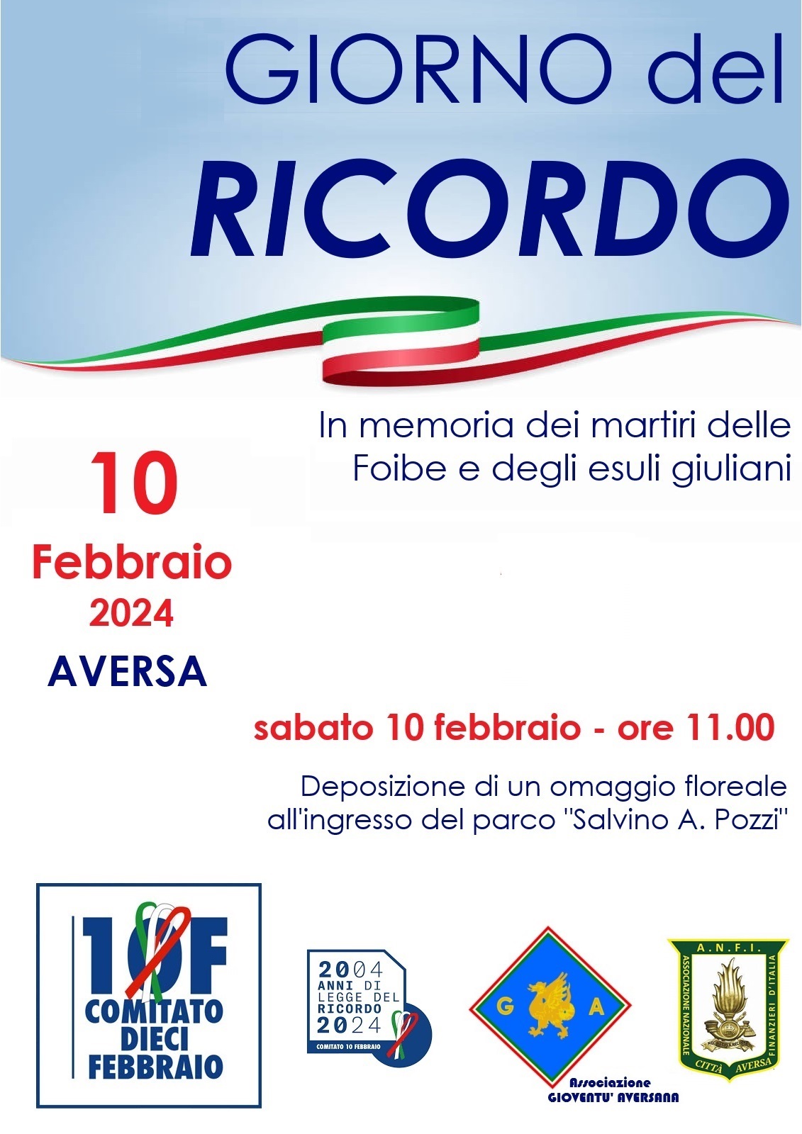 Il Comitato 10Febbraio, in occasione del Giorno del Ricordo, con il quale ogni anno si commemorano i Martiri delle foibe e l’esodo dal confine orientale d’Italia per l’occasione ha organizzato una cerimonia commemorativa ad Aversa all’ingresso del parco “Salvino Pozzi”, che nel dopoguerra ospitò i profughi giuliani: è stato deposto un omaggio floreale presso i cancelli d’ingresso dell’ex campo profughi baraccato, purtroppo ancora chiusi dopo i recenti lavori, e sono stati ricordati gli esuli e gli infoibati aversani. In particolare, la cerimonia di quest’anno è stata dedicata al finanziere Angelo De Vivo, scomparso nell’aprile del 1945 in Istria, con l’intervento dei suoi discendenti. All’organizzazione dell’evento hanno aderito l’associazione Gioventù Aversana, la sezione di Aversa dell’Associazione Nazionale Finanzieri e la delegazione locale dell’Istituto per la Guardia d’Onore alle Reali Tombe del Pantheon. Il Giorno del Ricordo, istituito della Legge 92/2004, di cui ricorre proprio quest’anno il ventennale, è occasione di studio, conoscenza e commemorazione delle tragedie della seconda guerra mondiale e del confine orientale d’Italia.