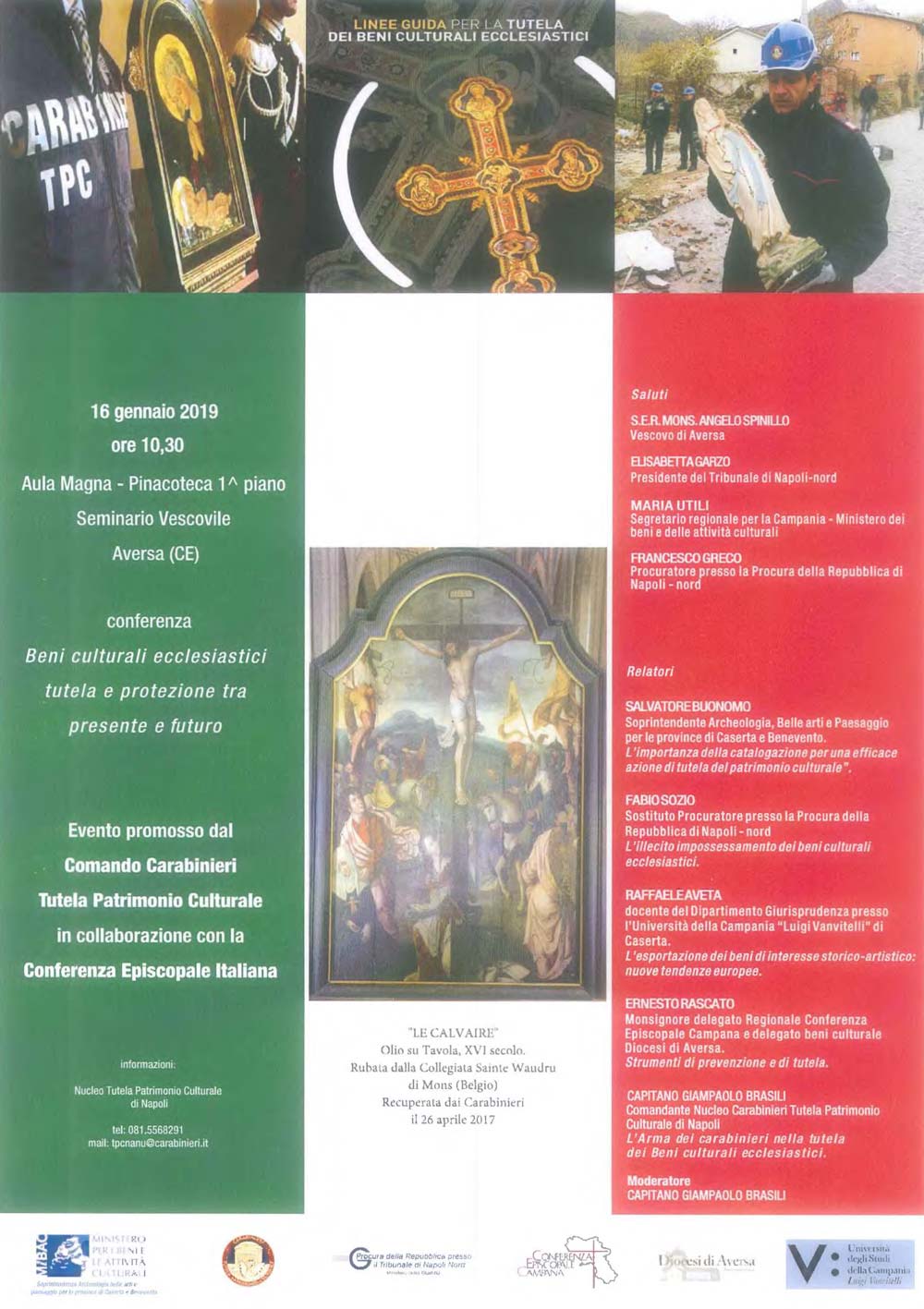 Diversi i relatori che saranno chiamati ad intervenire ciascuno su uno specifico argomento d’interesse: l’arch. Salvatore Buonomo, Dirigente Soprintendenza Archeologia, Belle Arti e Paesaggio , sull’ “Importanza della catalogazione per una efficace azione di tutela del patrimonio culturale”; il dott. Fabio Sozio, Sostituto Procuratore – Procura di Napoli Nord, sulla “Contraffazione di opere d’arte e beni archeologici: aspetti penalistici”; il prof. Raffaele Aveta, Dipartimento Giurisprudenza Università Vanvitelli , sulla “Circolazione dei beni culturali ecclesiastici”; Mons. Ernesto Rascato, Delegato Beni Culturali della Conferenza Episcopale Campana, sugli “Strumenti di prevenzione e di tutela”. A moderare la tavola rotonda sarà il Cap. Giampaolo Brasili, Comandante del Nucleo Tutela Patrimonio Culturale di Napoli, che relazionerà anche sul tema “L’Arma dei Carabinieri nella tutela dei beni culturali ecclesiastici”.