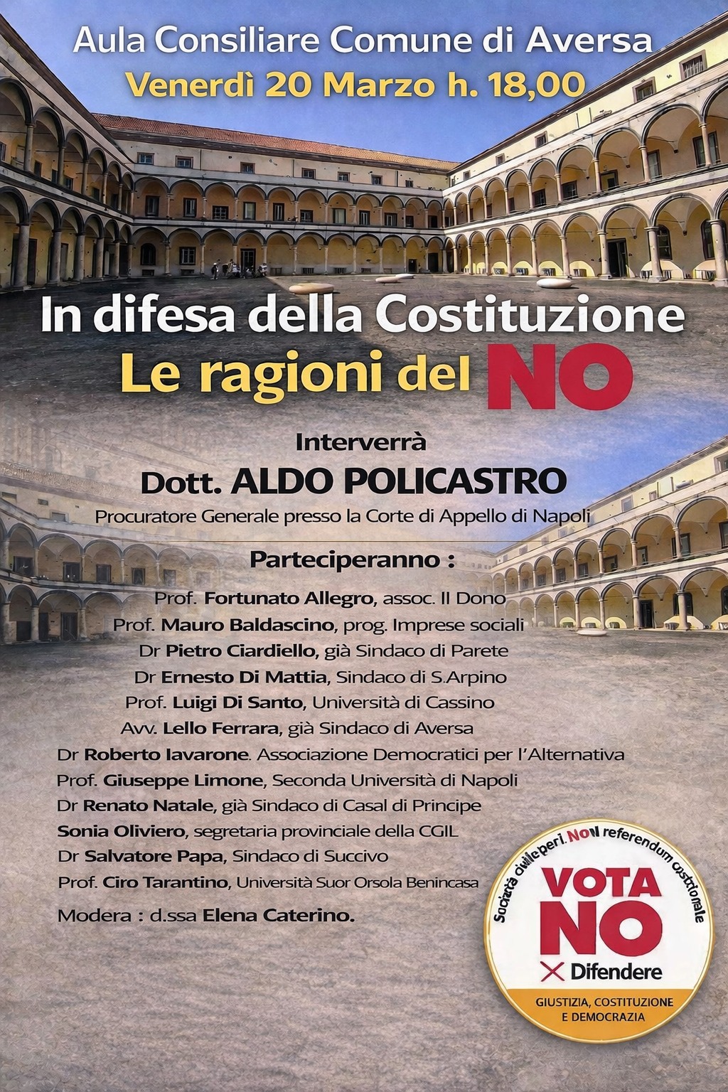 Si terrà oggi la chiusura della campagna referendaria del Comitato per il No di Aversa., alle 18 l’aula consiliare della Città normanna ospiterà il Procuratore Generale presso la Corte di Appello di Napoli Aldo Policastro. “In difesa della Costituzione – Le ragioni del No” sarà il titolo dell’incontro moderato da Elena Caterino, in cui sono previsti anche gli interventi di esponenti locali. Originario di San Cipriano d’Aversa, magistrato anticamorra di grande esperienza, già in forza alla Direzione Distrettuale Antimafia partenopea ed ex Procuratore della Repubblica di Benevento, Policastro ricopre dal luglio 2024 il prestigioso incarico presso Corte di Appello di Napoli. Ad accoglierlo ci saranno alcuni sindaci dell’Aversano, ex primi cittadini del territorio, docenti universitari, rappresentanti sindacali e dell’associazionismo, che hanno assicurato la loro presenza.