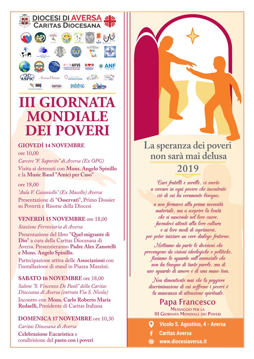 La III Giornata Mondiale dei Poveri è ormai alle porte: la diocesi di Aversa si prepara a vivere in pienezza un appuntamento che rappresenta anche uno dei momenti più intensi dell’intero anno pastorale. “Riannodiamo il filo riprendendo in mano il senso della giornata vissuta lo scorso anno, che traeva spunto dal grido dei poveri – un grido d’aiuto che partiva dal basso – rivolto verso l’alto”, spiega don Carmine Schiavone, direttore della Caritas diocesana. “Quest’anno il Papa ci invita a riflettere sullo splendido passaggio del Salmo 9, ‘La speranza dei poveri non sarà mai delusa’, che da anche il titolo alla giornata: il grido d’aiuto non resta inascoltato, ma dall’alto il Signore risponde restituendo ai poveri quella speranza che si rischia di smarrire dinanzi alle ingiustizie, agli stenti e alle sofferenze della vita”.
