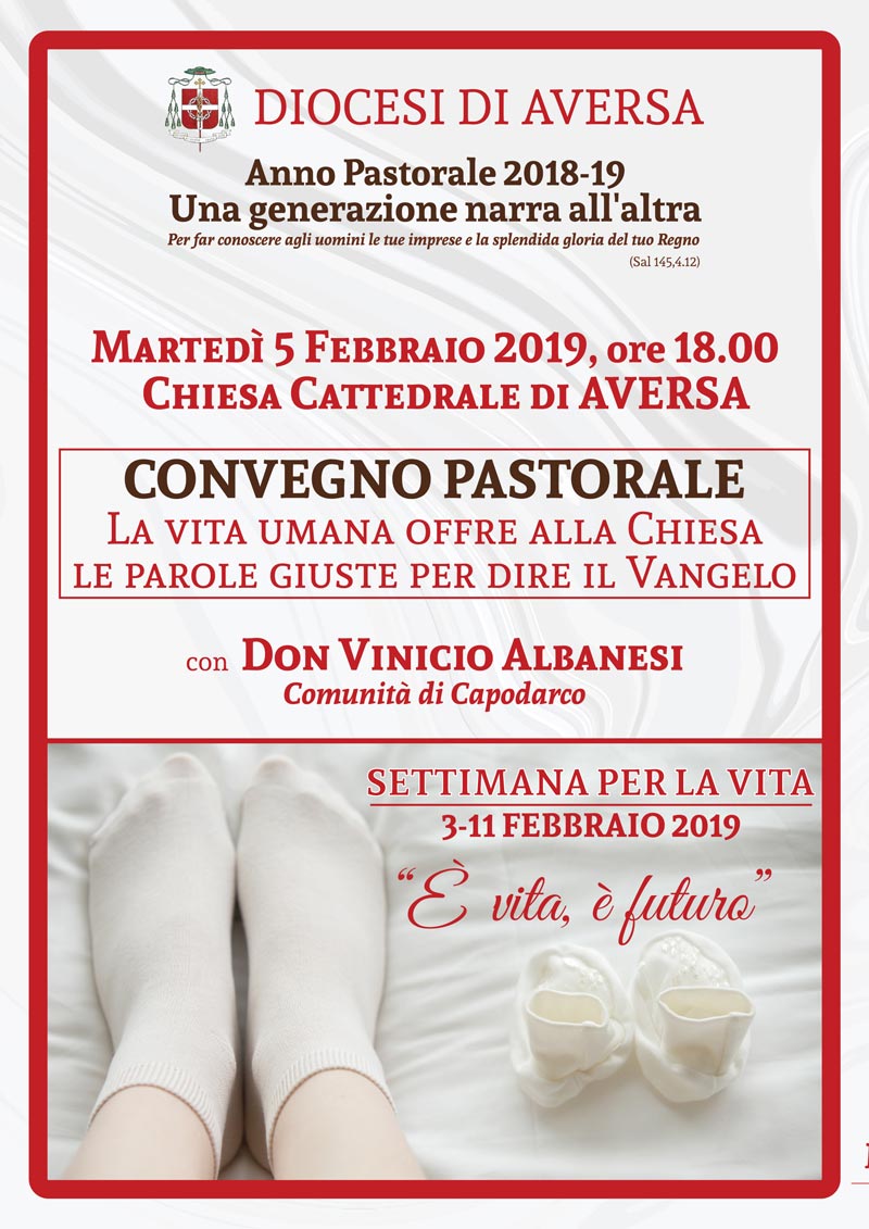 “Siamo consapevoli della grande importanza che l’attenzione e la riflessione sulla vita hanno oggi nella vita dell’umanità”, commenta Mons. Angelo Spinillo: una consapevolezza, dunque, tradotta nella riproposizione di un’intera settimana di eventi (3 – 11 Febbraio 2019) dedicati alla celebrazione di quello che il Santo Papa Giovanni Paolo II definiva “Il Vangelo della vita”. “In ogni sua ricerca – aggiunge il Vescovo di Aversa – perfino quando scivola nel peccato, l’umanità sente di portare nell’anima una grande sete di vita, un desiderio di infinito capace di superare i limiti e i condizionamenti che ordinariamente la imprigionano”.