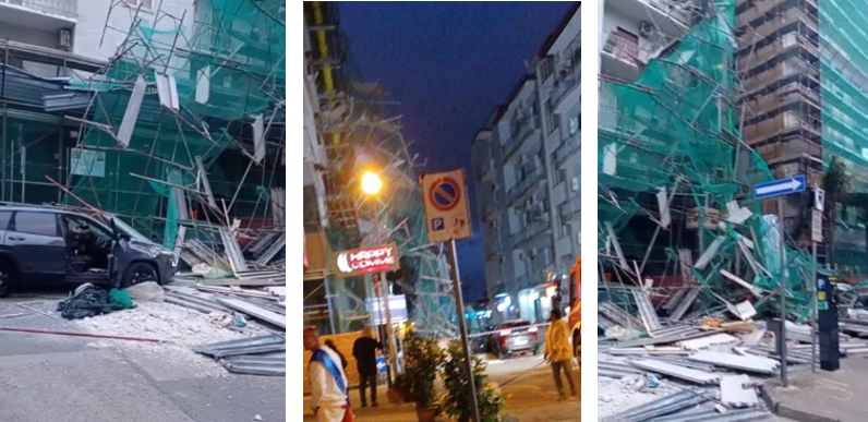 Questo pomeriggio, intorno alle ore 19.15, un’impalcatura edilizia in Via Raffaello ad Aversa, ha ceduto crollando rovinosamente al suolo. Parte del ponteggio, predisposto nel cantiere per la ristrutturazione della facciata di un edificio residenziale, è collassata per motivi ancora da accertare, intrappolando diverse auto in sosta.