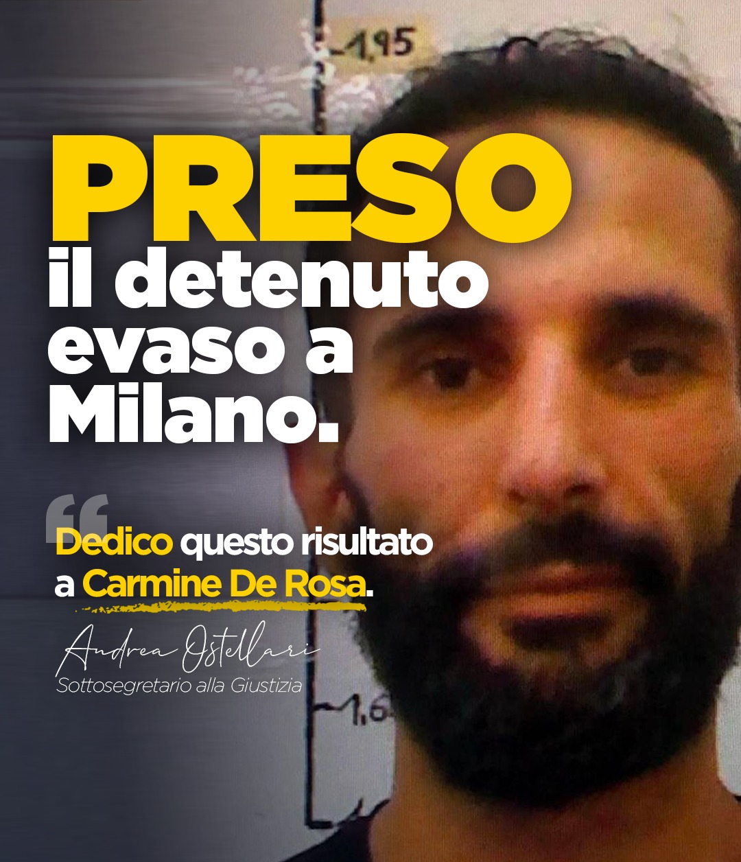 Il palestinese Mordjane Nazim, detenuto evaso  dall’ospedale San Paolo di Milano è stato nuovamente arrestato: lo ha riferito con un post su Facebook il sottosegretario alla Giustizia Andrea Ostellari, il latitante è stato rintracciato nella città svizzera di Ginevra. Per rincorrere Nazim mentre scappava dall’ospedale l’agente della Polizia Penitenziaria Carmine De Rosa, originario di Carinaro, è rimasto gravemente ferito precipitando dal secondo piano, ancor oggi si trova in gravi condizioni .“Grazie all’Interpol, alla Polizia Penitenziaria, a tutte le Forze dell’Ordine e agli investigatori che hanno collaborato all’arresto, avvenuto a Ginevra, del detenuto evaso pochi giorni fa, mentre si trovava in un Ospedale a Milano”, scrive il sottosegretario alla Giustizia. “Il primo pensiero va a Carmine De Rosa, l’agente, ancora ricoverato, che non ha esitato a rischiare la vita per fermarlo: caro Carmine, questo risultato è dedicato a te”, conclude Ostellari.