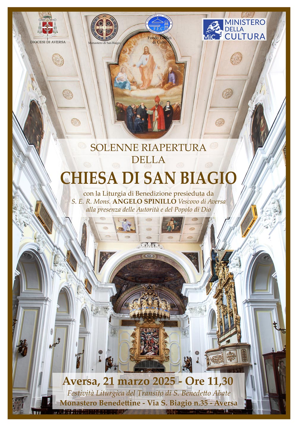Oggi, festività del Transito di San Benedetto, la Diocesi di Aversa, la Soprintendenza Archeologia Belle Arti e Paesaggio, la Prefettura, presentano la riapertura al culto pubblico del monumentale Tempio benedettino di San Biagio in Aversa, alla quale seguirà la consegna del restaurato Convento francescano di Sant’Antonio al Seggio e dell’abside della Chiesa di San Domenico.