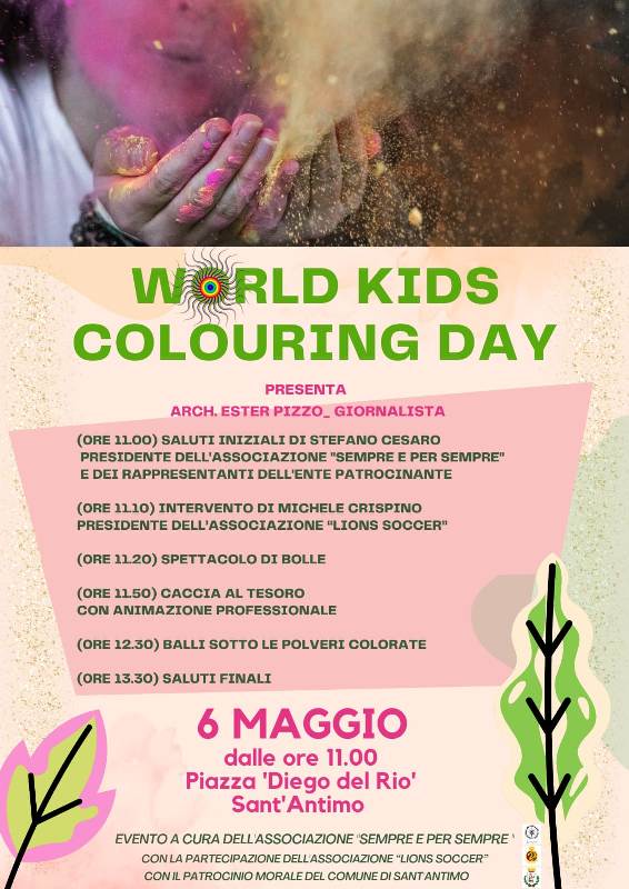 Sabato 6 Maggio, in occasione della Giornata mondiale del colore, si terrà presso la Villa comunale “Diego Del Rio” di Sant’Antimo il “WORLD KIDS COLOURING DAY”.