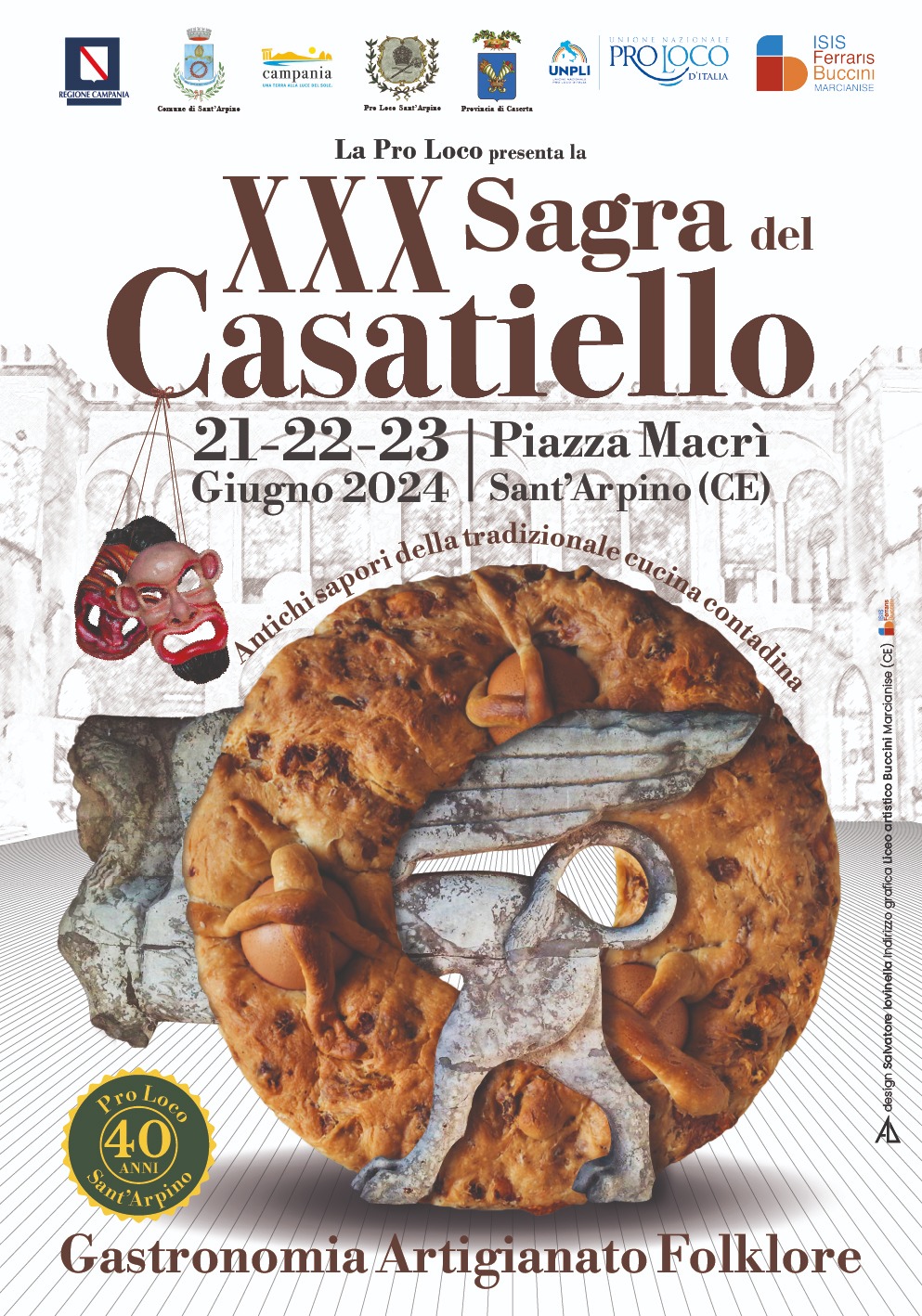 Scelto il Manifesto per la trentesima Sagra del Casatiello che si terrà a Sant’Arpino dal 21 al 23 giugno 2024. Inizia dunque il conto alla rovescia in vista di uno degli appuntamenti enogastronomici più attesi in Campania. La macchina organizzativa, coordinata dalla Pro Loco di Sant’Arpino (promotrice e ideatrice dell’evento con il patrocinio del Comune di Sant’Arpino), lavora a ritmo serrato per definire il programma della tre giorni che sarà ufficializzato nelle prossime settimane. Numerose le opere realizzate dagli allievi degli istituti d’arte nell’ambito del concorso “Un manifesto per la XXX edizione della Sagra del Casatiello”. Come da consolidata tradizione, la Pro Loco all’inizio dell’anno dirama il bando di concorso agli istituti artistici campani affinché i propri allievi possano proporre un’idea di manifesto che caratterizzi l’edizione della sagra per l’anno in corso. Presso la sede di corso Atellano, entro la scadenza del bando, sono pervenute centinaia di proposte frutto dell’estro e dalla creatività degli allievi. Per nulla facile il lavoro della giuria coordinata dal presidente della Pro Loco Aldo Pezzella e composta da artisti, docenti ed esperti di grafica. Dopo un paziente lavoro è stato decretato il vincitore del concorso e di conseguenza è stato individuato il manifesto che caratterizzerà l’immagine della speciale edizione della Sagra del Casatiello 2024, ad avere la meglio è stato Salvatore Iovinella studente del Liceo Artistico “O. Buccini” di Marcianise.  Ogni partecipante al concorso riceverà un attestato mentre il vincitore una borsa di studio. Nella sagra, inoltre, sarà allestita una mostra con tutti i bozzetti presentati. Grande la soddisfazione di Aldo Pezzella che sottolinea: “Di anno cresce sempre più il numero delle adesioni al concorso e la qualità delle proposte che ci sottopongono al punto da rendere la scelta davvero complicata”.