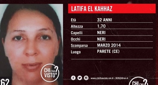 I familiari non hanno notizie da più di 5 anni di Latifa El Kahhaz, donna di 32 anni di nazionalità marocchina che nel marzo del 2014 si era trasferita da Torino a Parete, dopo che aveva conosciuto un uomo già sposato con un’altra donna. Del caso si è occupata anche la trasmissione “Chi l’ha visto?”, la donna dopo aver litigato con l’amante per questioni di soldi, in  un primo momento sarebbe ritornata a Torino poi nuovamente a Parete, ma da allora nessuno ha più notizie di lei.