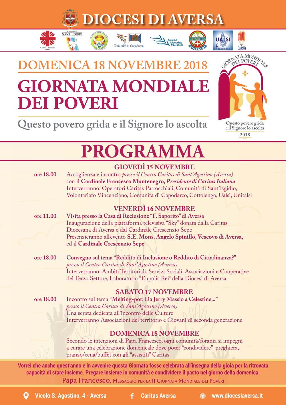 Domenica 18 novembre 2018 si celebrerà la seconda Giornata mondiale dei Poveri, istituita da Papa Francesco al termine del Giubileo della Misericordia nel 2016, nella lettera apostolica “Misericordia et misera”. In vista di questo appuntamento, anche la diocesi di Aversa si è attivata in collaborazione con la Caritas per compilare un fitto programma di iniziative.