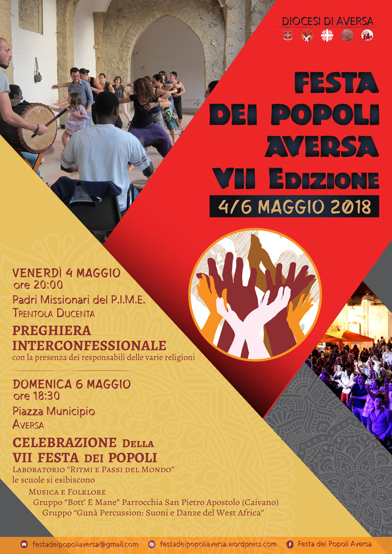 Il programma della VII Festa dei Popoli si svilupperà dunque in due giornate. Venerdì 4 Maggio alle ore 20:00, presso il PIME di Trentola Ducenta, verrà celebrata la Preghiera Interconfessionale con la presenza dei responsabili delle varie confessioni cristiane e religioni presenti sul nostro territorio diocesano. Domenica 6 Maggio ad Aversa (Piazza Municipio), a partire dalle 18:30, sarà allestito il “Villaggio della Fratellanza” con esposizioni artistiche e artigianali, musiche, danze e gastronomie delle varie tradizioni. Le scuole del territorio presenteranno i progetti ideati e realizzati nell’ambito del Laboratorio “Ritmi e passi dal mondo”. A seguire si esibiranno i gruppi musicali “Gunà Percussion”, composto da elementi africani e italiani, e “Botte E Mane” della Parrocchia San Pietro Apostolo in Caivano.