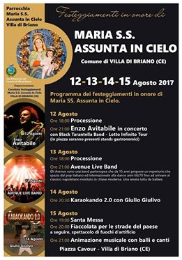 Dopo il concerto di Enzo Avitabile, l’esibizione dell’Avenue Live Band ed il karaoke in piazza, oltre alla tradizionale processione di Maria Santissima Assunta, proseguiranno anche oggi a Villa di Briano i tradizionali festeggiamenti patronali con la fiaccolata per le strade del paese e i fuochi d’artificio.