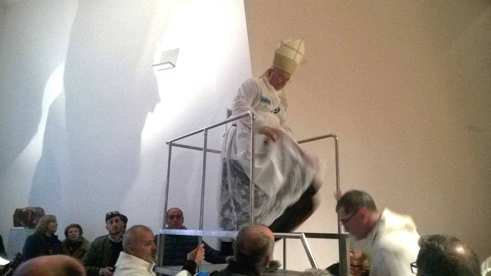 Durante l’atto liturgico, il Vescovo ha consacrato le dodici crocette in forma greca incastonate nella struttura, la Fonte Battesimale, il Tabernacolo e l’Altare, in cui è stata deposta la santa reliquia.