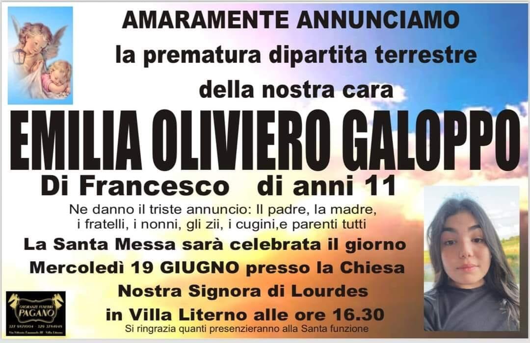 Sono stati celebrati mercoledì 19 giugno funerali della piccola Emilia Galoppo deceduta alla tenera età di 11 anni, le esequie si sono svolte nella chiesa Nostra Signora di Lourdes di Villa Literno, Emilia era stata colpita da una grave patologia.