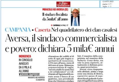 Aversa ha forse il Sindaco più povero d’Italia: lo scorso 12 ottobre il Fatto Quotidiano ha rivelato che il primo cittadino della città normanna dichiara un reddito annuo di appena 5000 euro, in pratica Francesco Matacena vive con meno di 500 euro al mese nonostante sia un affermato commercialista, a quanto pare lo studio professionale adesso è gestito dalla figlia.  Il sindaco ha detto ad Antonello Caporale del Fatto: “Vengo in bici in municipio, non fumo, bevo con grandissima prudenza, a tavola sono molto morigerato. Conduco una vita che rasenta l’umiltà e conosco i sacrifici (…)”. Il quotidiano diretto da Travaglio ha scoperto che il sindaco non è il solo povero tra gli eletti in comune, altri tre consiglieri comunali dichiarano redditi poco superiori dl suo.