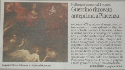 Le “intelligenze” aversane continuano a rimanere alquanto indifferenti rispetto al ritrovamento dell’Assunta del Guercino nella Chiesa di San Francesco, ciò del resto avviene anche in relazione a tutto il notevole patrimonio artistico e monumentale che la città normanna (e il suo circondario) ha immeritatamente ereditato dagli avi. Un’esatta dimensione del valore della scoperta ed ovviamente dell’opera ritrovata ad Aversa lo si capisce dalla notizia con la quale apriva ieri il quotidiano “Libertà” di Piacenza, città dove si terrà un convegno internazionale di studi sull’arte del Guercino in cui verrà presentato il dipinto ritrovato. L’appuntamento è per il 22 e il 23 marzo, esso introdurrà una mostra di opere del Guercino che si terrà nella stessa Piacenza dal 4 marzo al 4 giugno. Scrive la Libertà: “C’è un qualcosa di magico nel ritrovamento di uno splendido dipinto non noto di Giovanni Francesco Barbieri, detto Guercino, che raffigura l’Assunta ed è custodito nella Chiesa di San Francesco ad Aversa. Proprio nell’anno della grande riscoperta piacentina del pittore seicentesco di cento (…)”. Il livello di quanto si sta allestendo a Piacena lo si deduce dai relatori del convegno : Daniele Benati – Professore Università di Bologna; Babette Bohn – Fort Worth, Texas Christian University; Francesca Cappelletti – Professore Unversità di Ferrara; Patrizia Cavazzini – Professore American Academy, Roma; Sonia Cavicchioli – Professore Università di Bologna; Keith Christiansen – Curatore d’Arte Europea del Metropolitan Museum di New York; Elizabeth Cropper – Direttore Center for Advanced Study in the Visual Arts, Washington; Andrea Emiliani – già Direttore Pinacoteca Nazionale, Bologna; Gabriele Finaldi – Direttore National Gallery, Londra; Elena Fumagalli – Professore Università di Ferrara; Barbara Ghelfi – Professore Università di Bologna; Carlo Giantomassi – Restauratore; Fausto Gozzi – Direttore Pinacoteca Civica “Il Guercino”, Cento; Sergio Guarino – Curatore Musei Capitolini, Roma, Angelo Mazza ¬– già Ispettore Soprintendenza di Modena e di Reggio Emilia; Raffaella Morselli – Professore Università di Teramo; Massimo Pulini – Docente Accademia Belle Arti, Bologna; Richard Spear – Professore University of Maryland; David Stone – Professore University of Delaware; Nicholas Turner – già Vice Responsabile Dipartimento Disegni e Stampe, British Museum, Londra