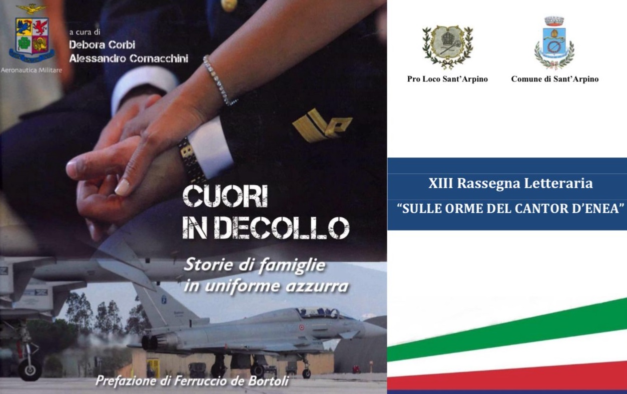 A Sant’Arpino nuovo appuntamento della rassegna letteraria “Sulle Orme del Cantor d’Enea”: si è svolta oggi nel seicentesco Palazzo Ducale “Sanchez de Luna” la presentazione del libro “Cuori in decollo”, scritto dal colonnello Alessandro Cornacchini e dal maggiore Debora Corbi con la prefazione di Ferruccio De Bortoli. La rassegna, ideata e promossa dalla Pro Loco con il patrocinio del Comune di Sant’Arpino, è giunta alla XIII edizione, e come da tradizione vede confluire nel centro atellano alcuni fra i più interessanti autori del panorama culturale nazionale e campano. L’appuntamento è stato coordinato dal giornalista Elpidio Iorio . Tra gli altri sono intervenuti gli autori: Debora Borrelli, Docente dell’Università “Vanvitelli”; Luigi Carrino, Presidente del Distretto Aerospaziale della Campania, Ordinario presso l’Università di Napoli Federico II; Luigi Casali, Generale di Divisione Aerea e Comandante dell’Accademia Aeronautica di Pozzuoli.