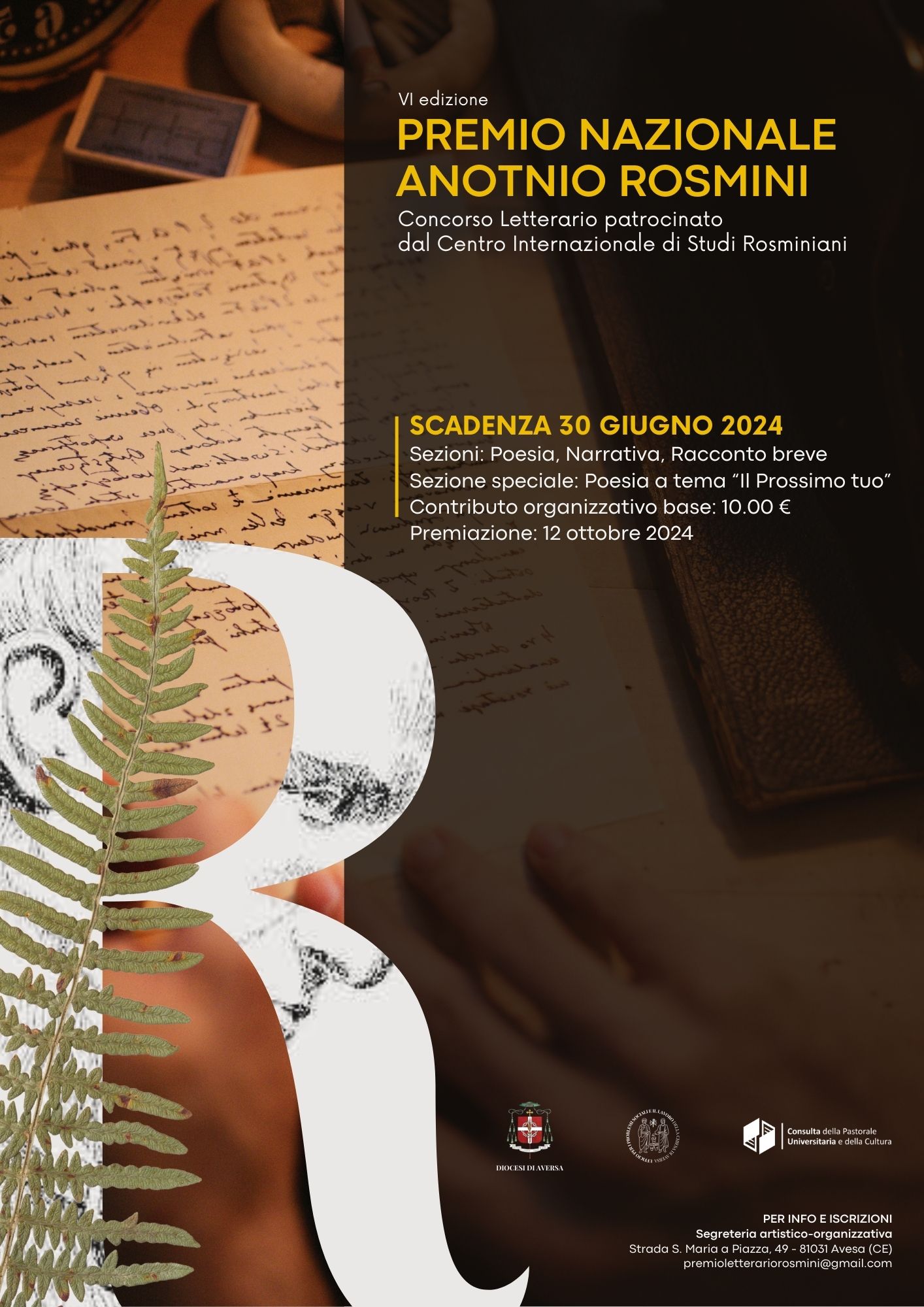 Bandito il Premio Nazionale “Antonio Rosmini”, il concorso letterario della Diocesi di Aversa patrocinato dal Centro Internazionale di Studi Rosminiani giunge alla sua VI edizione rinnovato nel regolamento e nel partenariato. C’è tempo fino al 30 giugno per partecipare con opere di poesia, narrativa o racconto breve a tema libero; prevista anche una sezione di poesia sul tema “Il Prossimo tuo”.
