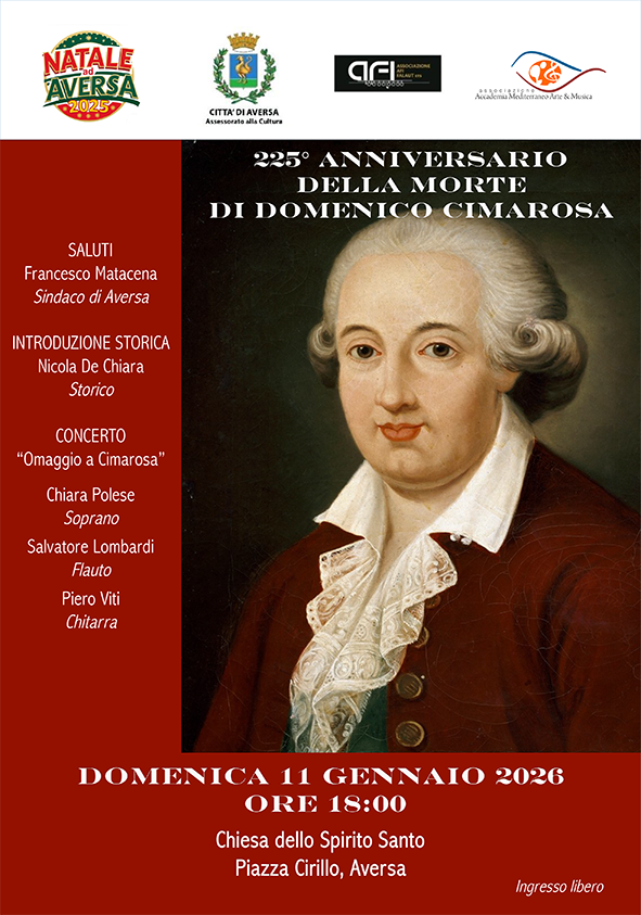 Domenica 11 gennaio, con inizio alle ore 18,00 nella chiesa dello Spirito Santo, ideato da Piero Viti e da Nicola De Chiara, direttore artistico del “Natale ad Aversa 2025”, si terrà un appuntamento culturale per celebrare il 225° anniversario della nascita di Domenico Cimarosa, il grande compositore nato ad Aversa. Dopo i saluti del Sindaco Francesco Matacena, sarà lo stesso De Chiara ad aprire la serata con un’introduzione storica sugli ultimi giorni di Cimarosa, aprendo uno squarcio sulla questione dei resti del compositore finora mai trovati, indicando anche le ultime indagini che si stanno mettendo in campo per arrivare a ritrovarli. Sarà, infine, la volta del concerto dal titolo “Omaggio a Cimarosa” con l’esibizione del soprano Chiara Polese, accompagnata da Salvatore Lombardi (flauto) e Piero Viti (chitarra), che vedrà l’esecuzione delle migliori musiche cimarosiane.