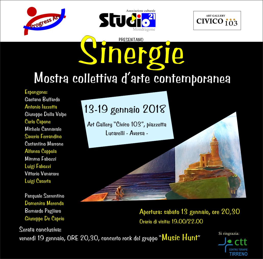 Panta rei, tutto scorre. Se il mondo è un costante fluire, la pittura diventa un modo per scorgerne i tratti, rendendo gli stessi eterni nel ricordo di chi osserva. Un dipinto è, dunque, un insieme di sensazioni, le stesse che l’associazione “Progress Art”, presieduta dall’artista Gaetano Buffardo di Aversa, vuole trasmettere a tutti coloro i quali parteciperanno alla mostra collettiva d’arte contemporanea dal titolo “Sinergie”, che si terrà dal 13 al 19 gennaio prossimo presso l’Art Gallery del locale “Civico 103”, in piazzetta Lucarelli, ad Aversa. La prima serata avrà inizio alle ore 20:30, nei successivi giorni è possibile visitare la galleria d’arte dalle 19:00 alle 22:00. Esporranno le proprie opere gli autori Gaetano Buffardo, Antonio Iazzetta, Giuseppe Della Volpe, Carlo Capone, Michele Cannavale, Saverio Ferrandino, Costantino Marrone, Alfonso Coppola, Mimmo Fabozzi, Luigi Fabozzi, Vittorio Vanacore, Luigi Caserta, Pasquale Sorrentino, Domenico Merenda, Bernardo Pagliaro e Giuseppe De Caprio. Nella serata conclusiva del 19 gennaio, a partire dalle ore 20:30, si esibirà in concerto anche il gruppo rock “Music Hunt”. “Abbiamo scelto Civico 103 – dice il presidente -, perché è una location a modo ed elegante, funzionale all’arte poichè richiama l’atmosfera dell’antichità di un convento, con le sue alte ed austere mura, piene di fascino e storia. Al centro dell’attenzione, abbiamo posto il tema della sinergia, dell’unione tra forze che si associano per il progresso; appunto, il progresso dell’arte. Gli artisti provengono da tutta la regione e sarà, indubbiamente, bello vedere come il territorio favorisca la creazione di propensioni artistiche diverse nonostante i figli abbiano la stessa madre. Progress Art ha promosso diversi eventi di arte, cultura e ricerca. Quest’associazione è nata dall’idea di dare voce all’arte che si mischia alla musica. Sono due realtà che vanno a braccetto; sicuramente entrambe sono espressione dell’interiorità umana. Ringrazio Antonio Iazzetta per averci permesso di utilizzare il suo locale, l’associazione Studio 21 per la sua collaborazione e tutti coloro i quali hanno contribuito alla buona riuscita dell’evento”.