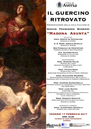Guercino conferenza AversaDomani venerdì 17 febbraio, dalle ore 18.00, presso la chiesa di San Francesco ad Aversa si terrà la conferenza “Il Guercino ritrovato”. Un incontro di presentazione alla città dell’opera Madona Asunta, custodita nella medesima chiesa, recentemente attribuita al pittore centese Giovanni Francesco Barbieri, noto come Guercino.