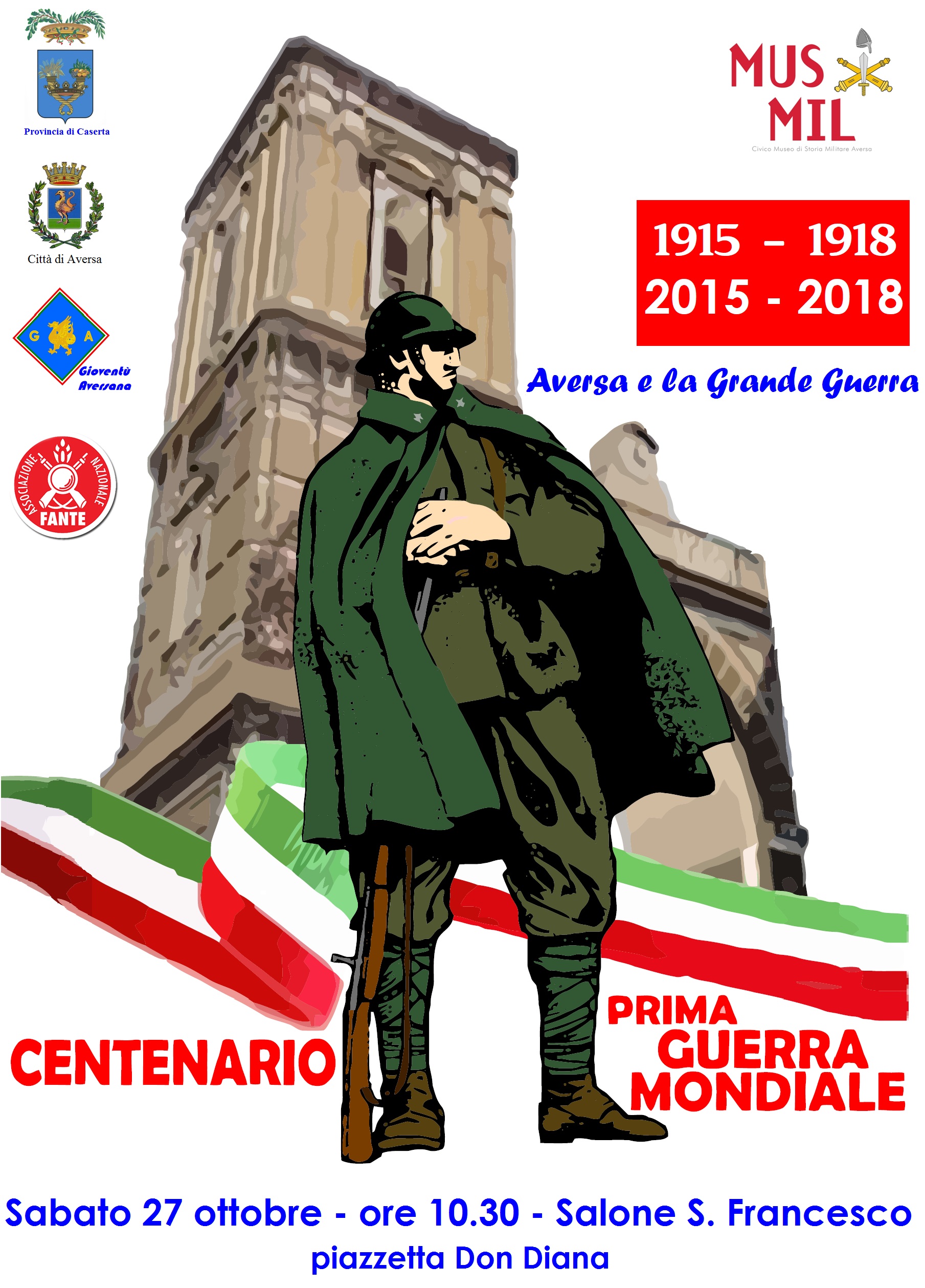 Il giorno 27 ottobre, alle ore 10.30, nel Salone San Francesco in piazzetta Don Diana ad Aversa, il Civico Museo di Storia Militare organizzerà una conferenza dal titolo “Aversa e la grande Guerra”, nell’ambito delle iniziative celebrative del Centenario della Prima Guerra Mondiale. Interverranno il Gen. Domenico Cagnazzo, Ispettore Regionale dell’Ass.ne Naz. Carabinieri, il Gen. Nicola Della Volpe, già Vicecomandante dell’Uff. Storico Stato Maggiore Esercito, l’Avv. Alberto Zaza d’Aulisio, Presidente della Società di Storia Patria Caserta-Terra di Lavoro, il Dott. Salvatore de chiara, Curatore del Museo. Nell’occasione sarà anche presentato al pubblico il catalogo della mostra “Guerra di Popolo. Propaganda, mobilitazione civile e partecipazione popolare ad Aversa durante la Prima Guerra Mondiale”.