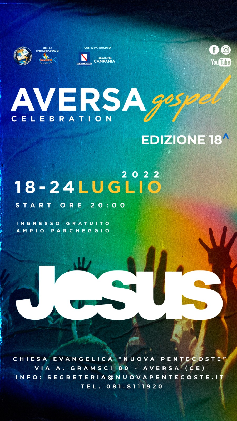 Non resta che decidere e programmare la propria partecipazione in una location tutta all’aperto, con posti a sedere e parcheggio gratuito per delle serate che annunciano di essere fuori dall’ordinario. Per chi vorrà seguirle a distanza, la manifestazione sarà trasmessa in diretta streaming da TeleOltre (Youtube, Facebook, Instagram) e sul digitale terrestre da Parole di Vita (canale 245). E che Aversa Gospel sia!