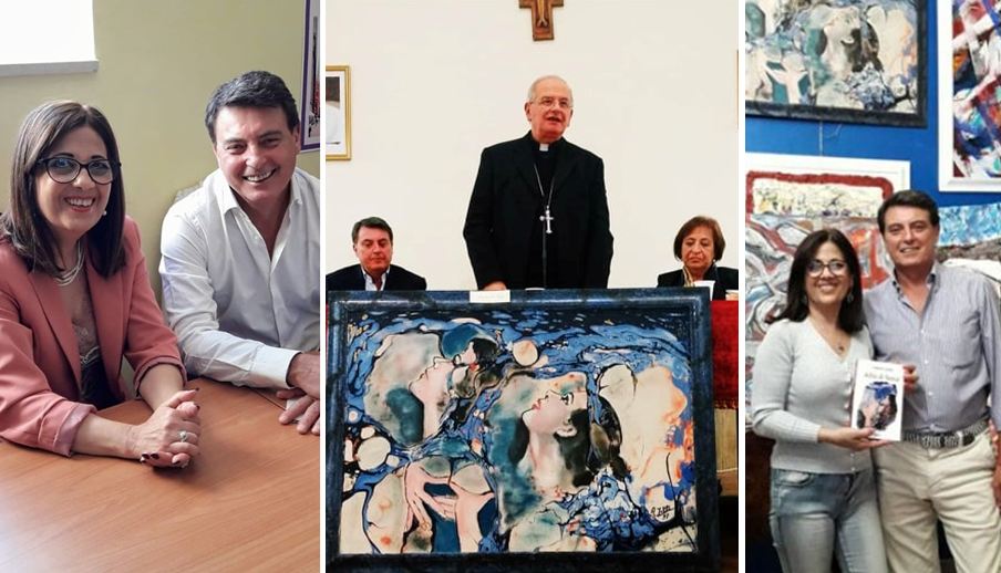 Nella gremita sala, anche l’artista internazionale Anna Maria Zoppi, autrice di “Abbraccio”, il dipinto scelto da Zannini per la copertina del suo romanzo. La tela, racconta l’artista casalese: “Potrebbe sembrare un abbraccio tra un uomo e una donna innamorati, ma in realtà va ben oltre quell’amore. È del ’97, ed io, già mamma di tre bambini, avevo il mio ultimo figlio che amava pasticciare con i colori. Un giorno gli misi una tela sul cavalletto e la tavolozza tra le mani e lo lasciai divertire, sedeva al mio fianco e così iniziai ad immaginare il suo profilo da grande… la mano iniziò ad andare da sola! Venne fuori un bellissimo abbraccio materno, in cui stringevo mio figlio da dietro e con lui guardavo l’universo. In quella tela aveva la mia stessa età, lo dipinsi già grande poiché speravo di poterlo abbracciare per anni fino alla sua maturità. Un desiderio avverato!”