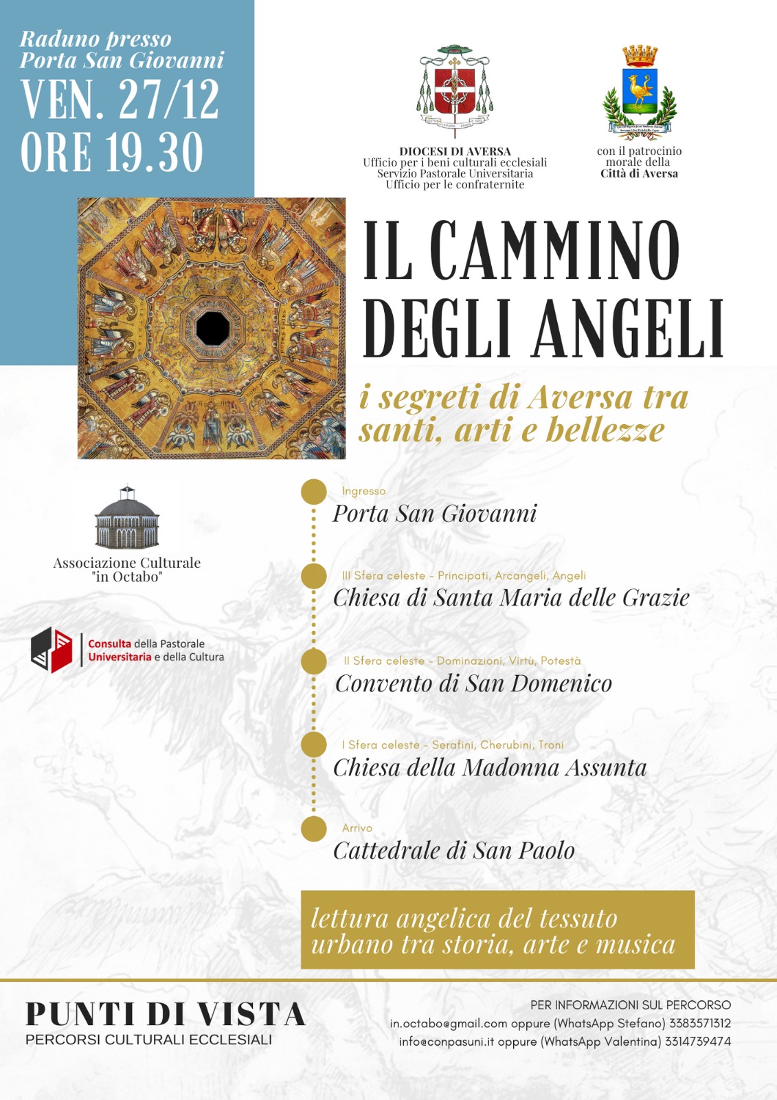 Saranno presenti alla visita insieme con il vescovo Angelo Spinillo  che come sempre segue i lavori di CONPASUNI ed In Octabo, Mons. Ernesto Rascato, delegato regionale per i Beni culturali ecclesiali, don Mario Vaccaro, delegato diocesano della Pastorale Universitaria, don Michele Salato, delegato diocesano dell’Ufficio per le confraternite. “Camminando con gli Angeli” concluderà un ciclo di visite guidate che per tutto il mese di Dicembre sono state rivolte agli studenti delle scuole superiori e che hanno visto i giovani passeggiare per Aversa in questo mese con “AttrAversando con gli Angeli” per scoprire ed apprezzare il patrimonio storico-artistico della propria terra prima di partire alla scoperta delle capitali europee.