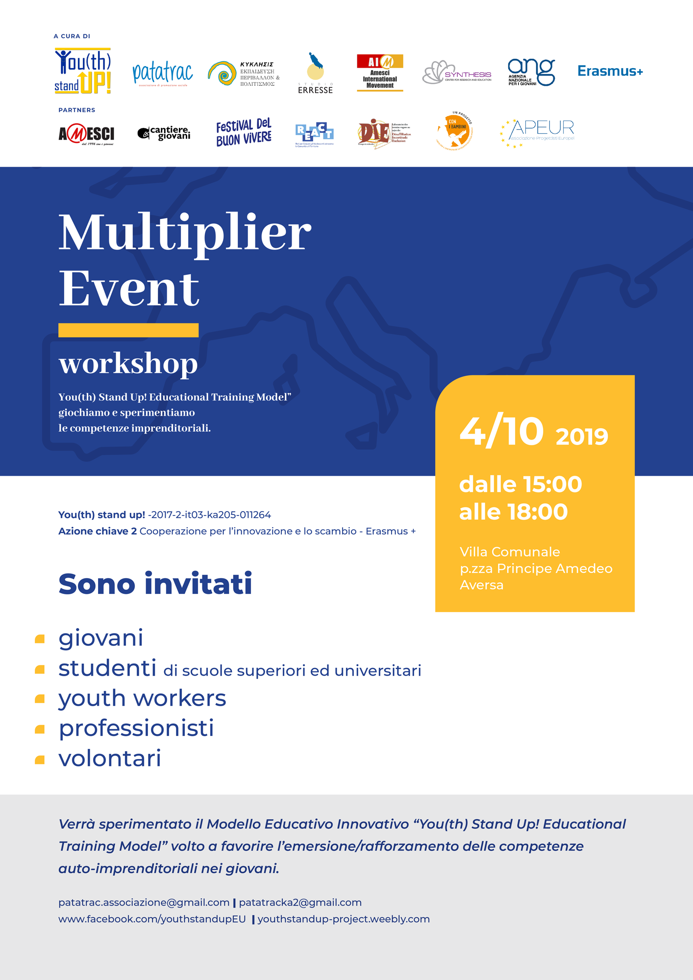 You(th) Stand Up Multiplier Event organizzato dall’Associazione Patatrac (Aversa) in collaborazione con Studio Erresse, Associazione Progettisti Europei – APEUR, Amesci e Amesci International Movement (AIM), Synthesys, Cyclisis, Cantiere Giovani, Festival del Buon Vivere, Liceo Scientifico Statale Nino Cortese (Maddaloni), Comune di Aversa si svilupperà in due momenti: