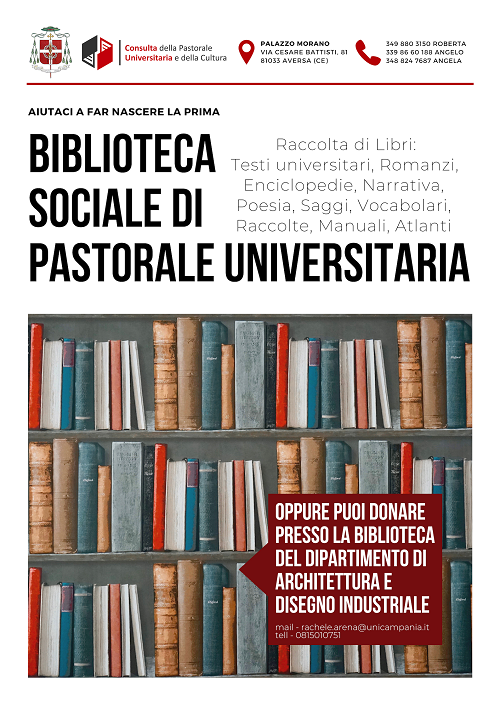 Nasce ad Aversa una nuova Biblioteca sociale, quella del Centro di Pastorale Universitaria della Diocesi in via Cesare Battisti 81. La struttura sarà gestita da CONPASUNI e destinata a biblioteca sociale, sala studio e lettura per gli studenti universitari e per gli studiosi di tutto il territorio diocesano. La Biblioteca sociale parte grazie al sostegno della Biblioteca del Dipartimento di Architettura e Disegno Industriale (DADI) dell’Università degli Studi della Campania “L. Vanvitelli” ed alle donazione dei privati e degli studenti. Il fine è quello di raccogliere volumi di letteratura scientifico- accademica che, accanto ai testi di lingua e cultura italiana e straniera, andranno a far parte della biblioteca sociale della Pastorale Universitaria. La biblioteca del DADI darà il suo sostegno all’iniziativa tramite la raccolta di libri disponibili in biblioteca in più copie o messi a disposizione per questo fine da docenti o altri utenti. Ma potranno partecipare a questa iniziativa anche altre realtà culturali e privati anche con un punto di raccolta presso la sede della biblioteca nel Palazzo dell’Istituto Morano in via Cesare Battisti. Per maggiori info e per poter donare e partecipare alla crescita della Biblioteca sociale contattare: 349 880 3150 (Roberta), 339 86 60 188 (Angelo), 348 824 7687 (Angela).