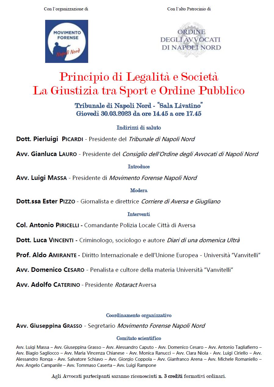 Si terrà domani, giovedì 30 marzo, dalle ore 14.45 presso la “Sala Livatino” del Tribunale di Napoli Nord, il convegno dal titolo “Principio di Legalità e Società. La Giustizia tra Sport e Ordine Pubblico”, un’importante occasione di confronto con Movimento Forense e l’Ordine degli Avvocati di Napoli Nord, per approfondire con relatori competenti il principio di Legalità nella società contemporanea, con particolare attenzione allo sport e all’ordine pubblico.