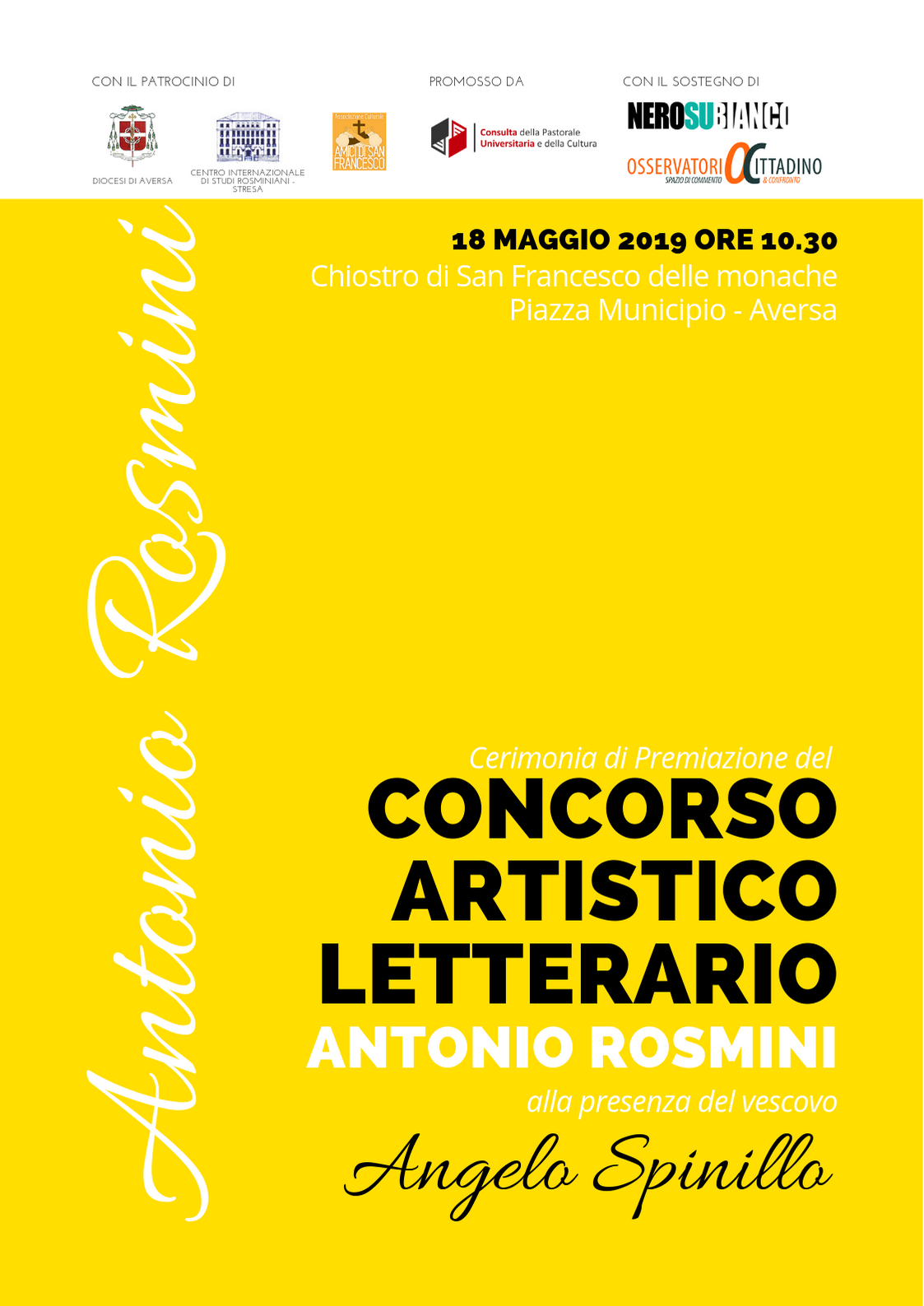 Mercoledì sera la Giuria del Concorso Artistico-Letterario “Antonio Rosmini” di CONPASUNI si è riunita per la valutazione definitiva degli elaborati ammessi. La cerimonia di premiazione avrà luogo, alla presenza di S.E. Mons. Angelo Spinillo, vescovo di Aversa, sabato 18 Maggio ore 10.30 presso la chiesa monumentale di San Francesco delle monache ad Aversa con il sostegno dell’associazione culturale “Amici di San Francesco”.
