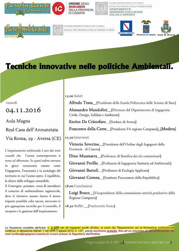 Tecniche innovative nelle politiche ambientaliSi terrà Venerdì 04 novembre, presso l’aula Magna della Real Casa dell’Annunziata in via Roma, 29 ad Aversa, il convegno dal tema “Tecniche innovative nelle politiche Ambientali”. L’iniziativa, promossa dall’Associazione “Fare Ambiente” che opera per la tutela ecologica, è patrocinata dalla Regione Campania e dal Comune di Aversa.