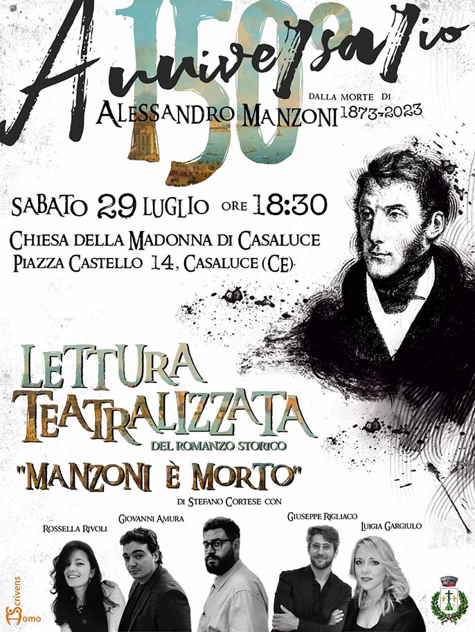 Sabato 29 luglio 2023, alle ore 18:30, presso la Chiesa della Madonna di Casaluce si terrà la lettura teatralizzata del romanzo storico “Manzoni è morto” di Stefano Cortese. L’evento è stato organizzato dall’amministrazione comunale in ricorrenza del 150° anniversario dalla morte di Alessandro Manzoni, “allo scopo – spiega l’assessore alla cultura Valentina Sorrentino – di commemorare la figura e l’opera del grande scrittore”.