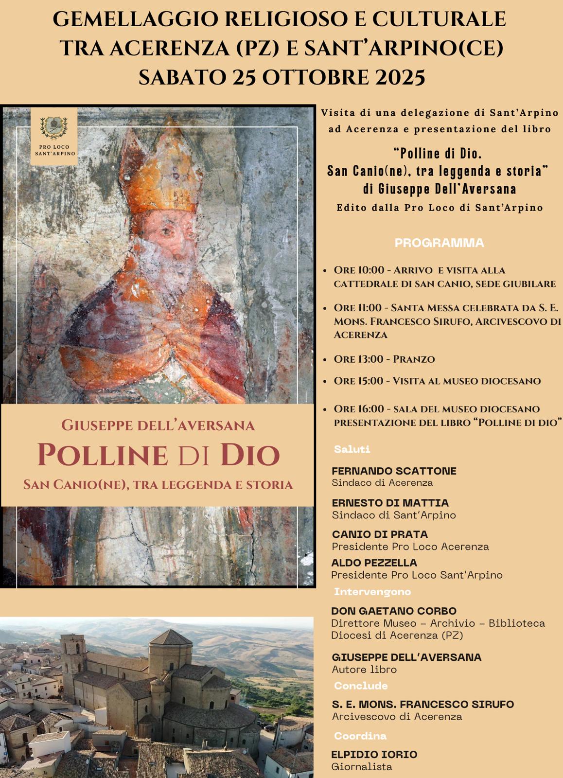 Sabato 25 ottobre 2025, nella sala del Museo diocesano di Acerenza, in provincia di Potenza, avrà luogo la presentazione del libro “Polline di Dio- San Canio(ne) fra leggenda e storia” di Giuseppe Dell’Aversana. Il volume edito dalla Pro Loco di Sant’Arpino, sarà il volano per un gemellaggio culturale e religioso fra Acerenza e Sant’Arpino nel nome di San Canione, evangelizzatore atellano venerato come patrono sia di Acerenza sia dell’intera arcidiocesi con il nome di Canio. Alla presentazione del libro, che ha riscosso un buon successo di critica e di pubblico, parteciperà S.E. Monsignor Francesco Sirufo arcivescovo della diocesi di Acerenza che ha espresso lusinghieri giudizi sul libro, un’approfondita ricerca storica su un santo che presenta affascinanti misteri. Una folta delegazione di santarpinesi, guidata dal sindaco Ernesto Di Mattia e dal presidente della Pro loco Aldo Pezzella, partirà in autobus per raggiungere la cittadina lucana di Acerenza, ove saranno ricevuti dal sindaco Ferdinando Scattone e dal presidente della Pro Loco Canio Di Prato. La giornata prevede la vista all’imponente cattedrale medioevale di Acerenza, sede giubilare, ove si conserva il bastone di san Canio e poi l’ascolto della santa messa celebrata dall’arcivescovo Sirufo. Dopo la messa ci sarà un pranzo in un rinomato ristorante acheruntino con prodotti tipici della Basilicata, seguirà la visita al Museo diocesano che conserva reperti archeologici del III secolo a.C e molte opere d’arte sacra della diocesi che costituiscono la memoria storica della comunità e dei suoi legami con il territorio. Alle 16:00 la presentazione del libro, che sarà moderata dal giornalista Elpidio Iorio con saluti dei rappresentanti delle istituzioni civili e religiose, interventi dell’autore del libro e di Don Gaetano Corbo, canonico della cattedrale di Acerenza, direttore del Museo diocesano e dell’archivio della biblioteca diocesana. Grande curiosità vi è nella comunità locale per questa presentazione e si prevede una folta presenza di pubblico in sala poiché San Canio è molto amato e venerato dal popolo acheruntino sempre desideroso di conoscere ulteriori notizie storiche su questo evangelizzatore atellano paleocristiano che tanta parte ha avuto nella diffusione del cristianesimo in Basilicata. Il gemellaggio religioso e culturale terminerà con lo scambio finale dei gagliardetti fra le due comunità, che già in passato avevano avuto scambi culturali mediante le due Pro Loco, associazioni molto attive nei rispettivi territori per la conoscenza e la valorizzazione delle radici storiche.