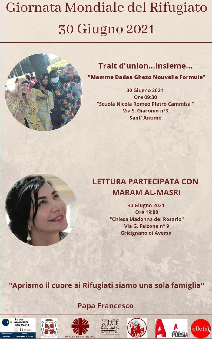 “Apriamo il nostro cuore ai rifugiati, facciamo nostre le loro tristezze, le loro gioie, impariamo dalla loro coraggiosa resilienza. Cosi tutti insieme faremo crescere una comunità più umana, una sola grande famiglia”. Con queste parole lo scorso 20 giugno Papa Francesco ricordava ai fedeli presenti all’Angelus, come alle comunità cristiane di tutto il mondo, che proprio quel giorno si celebrava la Giornata Mondiale del Rifugiato. Dieci giorni dopo, nell’ambito del Progetto SAI del Comune di Gricignano di Aversa, anche nella diocesi di Aversa è stata organizzata una giornata di riflessione e sensibilizzazione con due appuntamenti, entrambi in programma oggi 30 Giugno 2021. Il primo incontro, “Trait d’union…. Insieme”, è previsto per le 9:30 presso l’I.C. Romeo Cammisa di Sant’Antimo; nel tardo pomeriggio alle ore 19:00, la Chiesa Madonna del Rosario in Gricignano d’Aversa ospiterà la lettura partecipata con Maram al-Masri, poetessa e scrittrice siriana.
