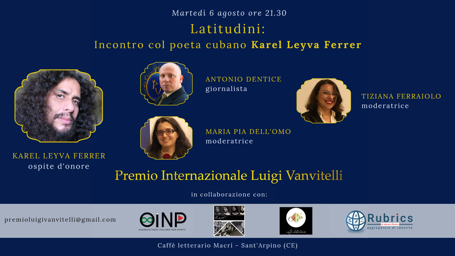 Da Cuba, l’autore Karel Leyva è giunto in Italia ospite del format “Latitudini” del Premio Internazionale Luigi Vanvitelli per un’intervista. Figlio d’arte, oltre che poeta, è promotore culturale e Coordinatore del Festival Internazionale di Poesia dell’Avana. “Nel fogliame ho visto moltiplicata la mia voce” è la silloge con cui l’artista è stato presentato il 6 agosto al Caffè letterario Macrí di Sant’Arpino. Oltre alla lettura delle poesie in lingua originale e nelle traduzioni italiane di Antonio Nazzaro, eccellenza nostrana che opera oltreoceano con prestigiosi riconoscimenti, recentemente anche da parte del Ministero della Cultura di Cuba, è stato previsto un momento di “scambio culturale” con alcuni artisti campani che hanno aderito alla prima edizione del Premio Internazionale L. Vanvitelli.