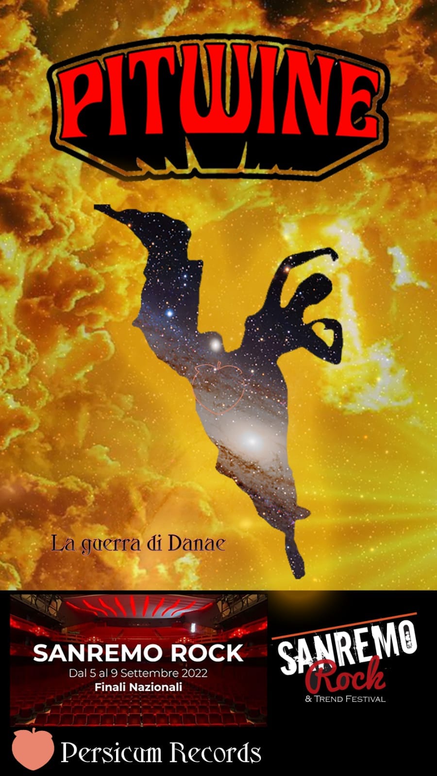 Pitwine è l’acronimo di Percoc in the Wine, a metà tra un omaggio a “peaches in regalia” di Frank Zappa e alla fusione, propria del genere progressive rock di idee e sonorità, come possono essere le pèsche nel vino, che da due prodotti totalmente diversi, solido e liquido, restituiscono un ulteriore prodotto totalmente diverso dai primi due.