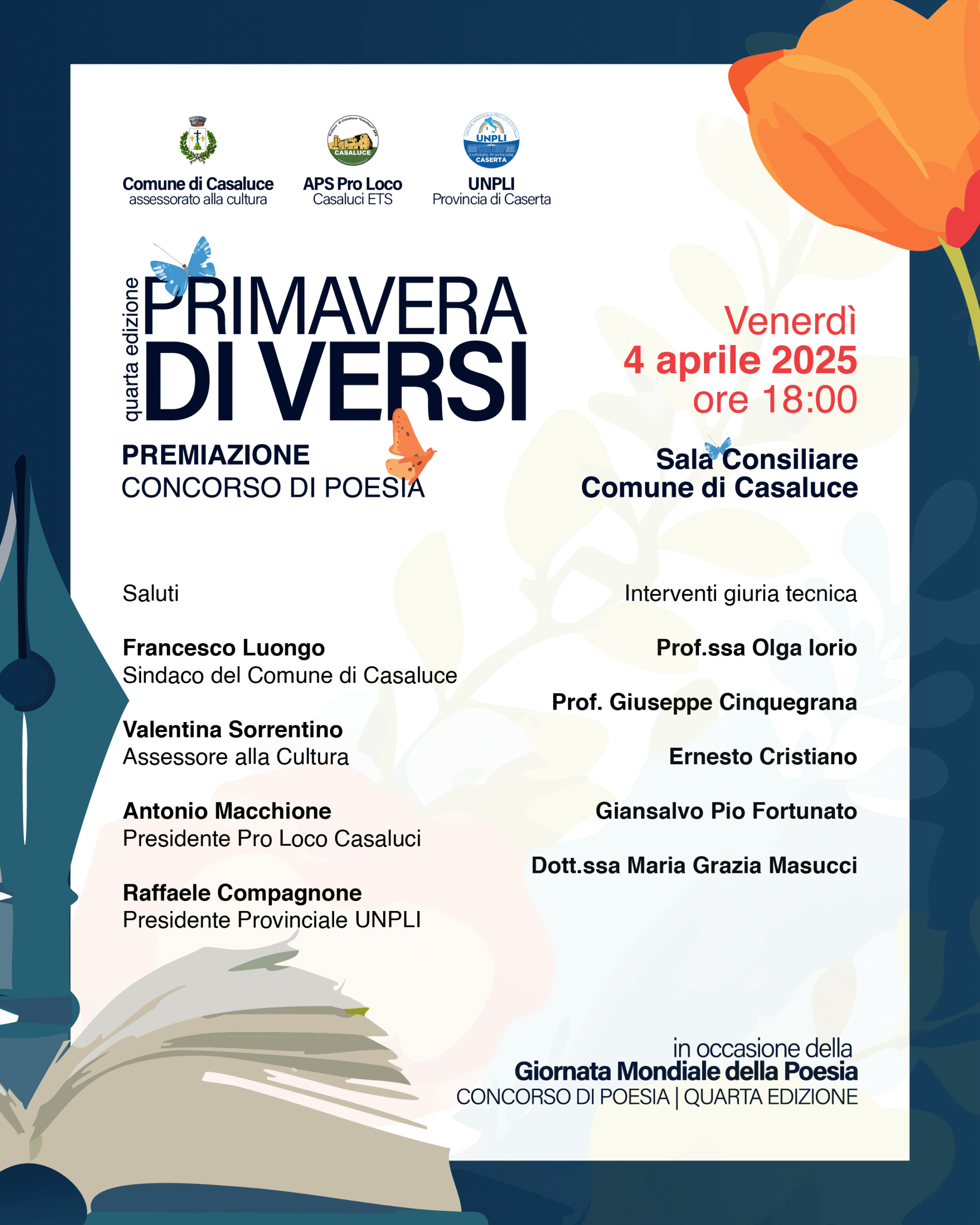 Venerdì 4 aprile 2025, alle ore 18:00, la Sala Consiliare del Comune di Casaluce ospiterà la cerimonia di premiazione del Concorso di Poesia “Primavera di versi”, giunto alla sua quarta edizione. L’iniziativa, organizzata dall’Amministrazione Comunale in collaborazione con la Pro Loco, ha raccolto quest’anno ben 170 domande di partecipazione da tutta la Campania, a conferma del crescente entusiasmo che circonda questo appuntamento culturale.