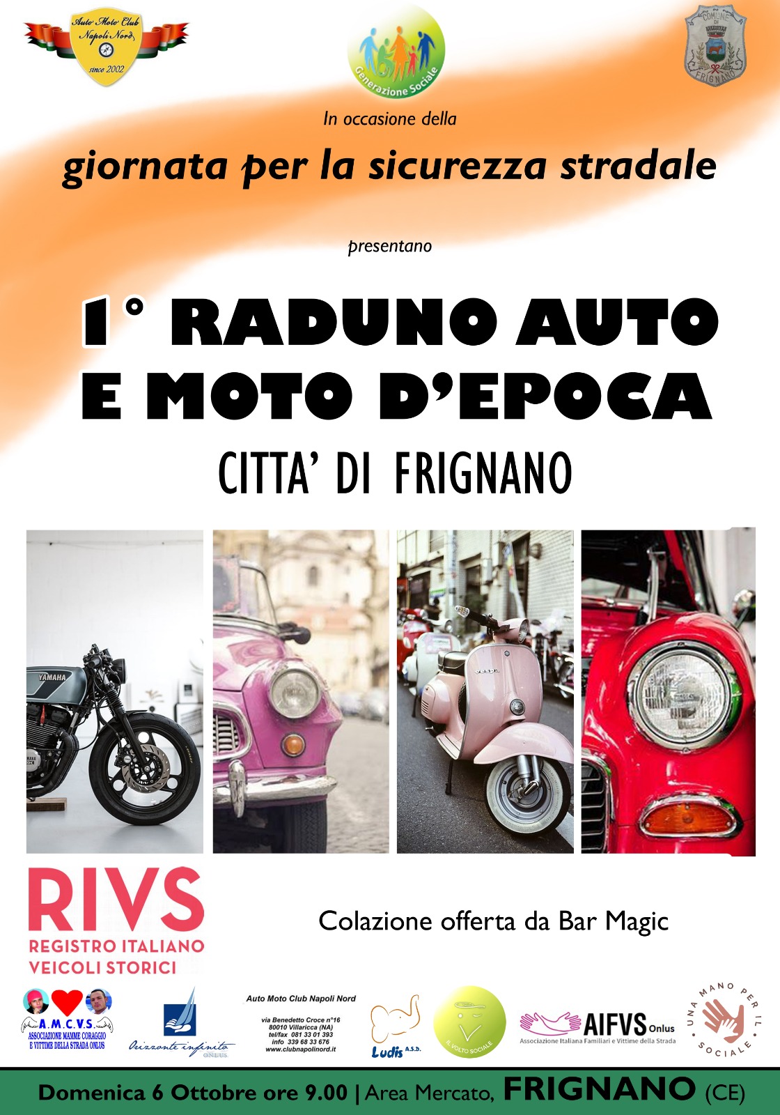 Una mattina all’insegna dei motori e della sicurezza stradale. Oggi presso l’area mercato, si terrà il 1° raduno auto e moto d’epoca (figuranti nel Registro Italiano Veicoli Storico). La manifestazione, patrocinata dal Comune di Frignano capitanato dal sindaco Gabriele Piatto, è stata organizzata dall’Auto Moto Club Napoli Nord di Matteo Ciccarelli e dall’associazione “Generazione Sociale” presieduta da Nicola Pagano. Ad appoggiare l’evento anche l’associazione “Mamme Coraggio e Vittime della Strada” Onlus (A.M.C.V.S.), presieduta da Elena Ronzullo, l’associazione “Orizzonte Infinito Onlus”, l’associazione “Ludis”, l’associazione di volontariato “Il volto sociale”, l’associazione Italiana Familiari e Vittime della Strada Onlus (A.I.F.V.S. Onlus), nella persona del referente Aversa e agro aversano Biagio Ciaramella, e l’associazione “Una mano per il sociale”.