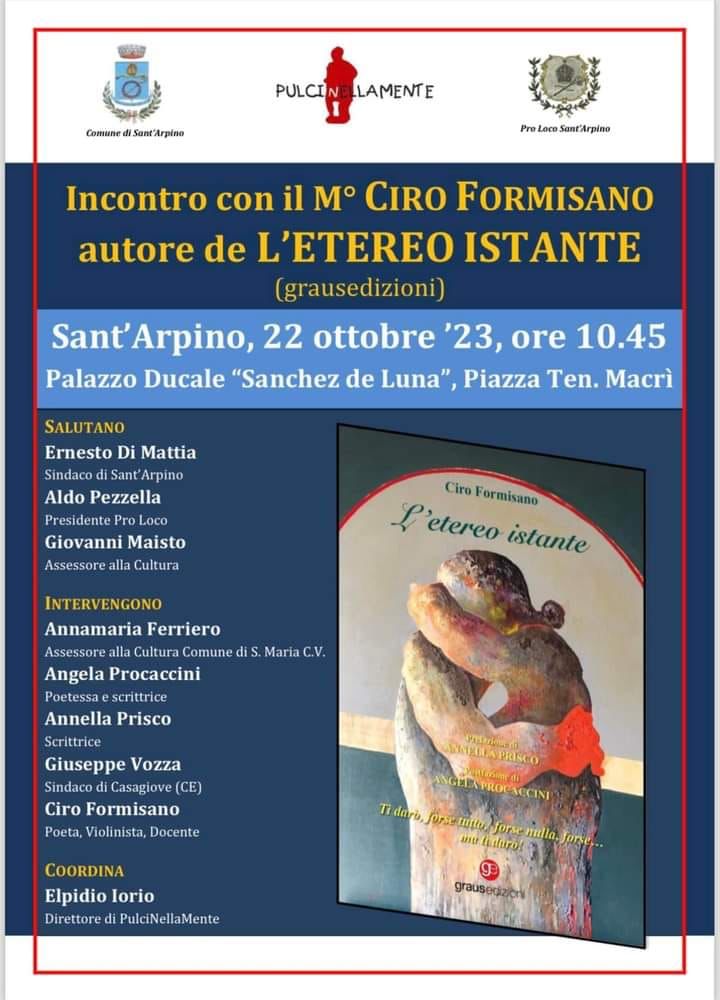 A Sant’Arpino domenica prossima, 22 ottobre 2023, alle ore 10:45, nel seicentesco Palazzo Ducale “Sanchez de Luna” si terrà un incontro con il maestro violinista Ciro Formisano autore de “L’etereo istante” (Graus Edizioni), composizioni in versi che tra l’altro è stata tra le 135 opere candidate al Premio Strega per la Poesia 2023.