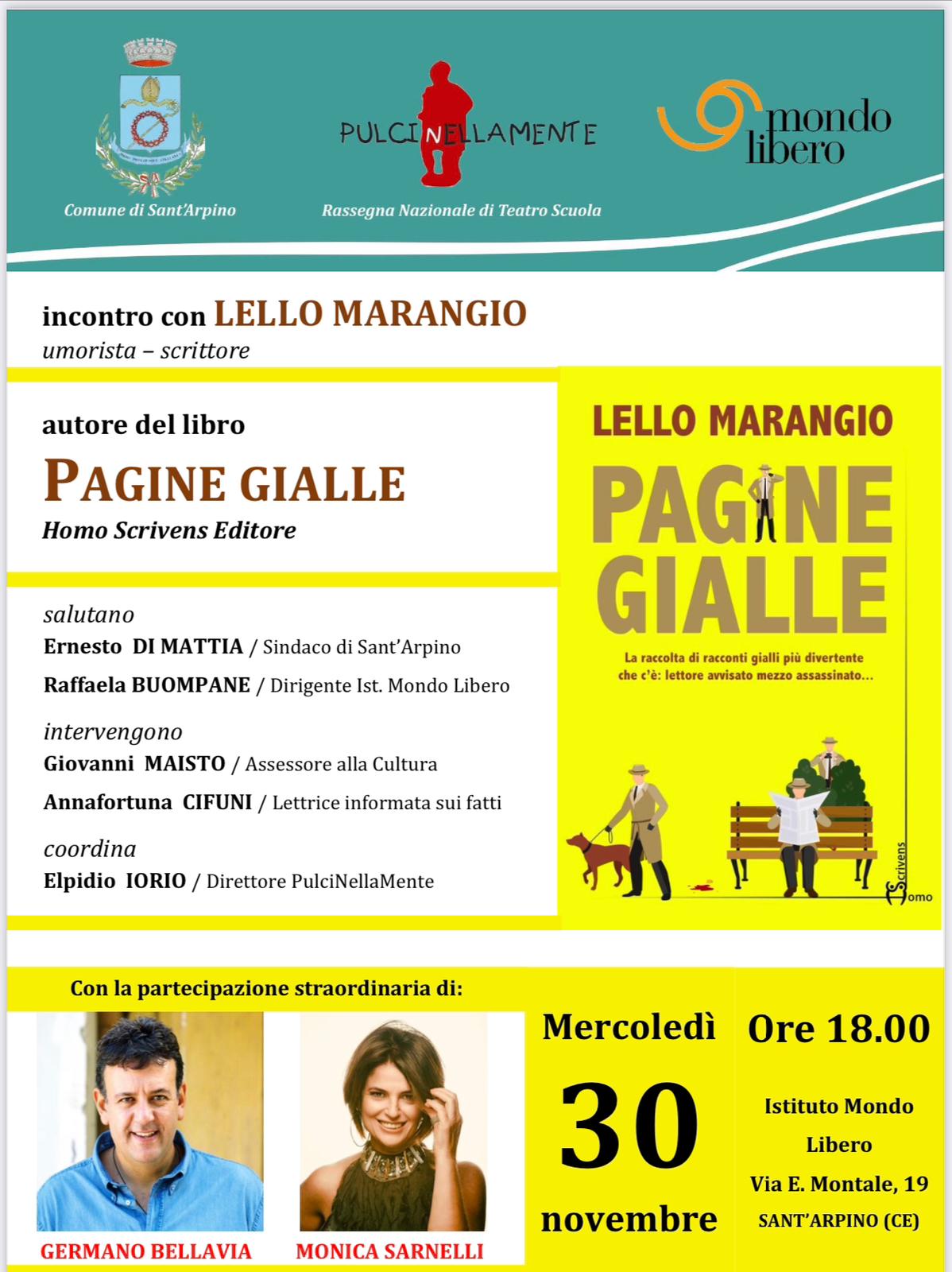 A Sant’Arpino, domani alle 18.00, si terrà la presentazione di «Pagine Gialle», ultima fatica editoriale dell’umorista e scrittore Lello Marangio, edito da Homo Scrivens, nella collana Direzioni immaginarie. Si tratta di una raccolta di gialli comici nei quali s’indaga, si raccolgono indizi e si muore. Sì, dal ridere. L’appuntamento, che è promosso e organizzato da PulciNellaMente col patrocinio del Comune di Sant’Arpino, è inserito nel progetto “Atella Viva, un Festival lungo un Anno” e si terrà presso l’Auditorium dell’Istituto Mondo Libero, in via Eugenio Montale 19. L’autore è un grande riferimento per la scuola comica napoletana. Da più di trent’anni, infatti, lavora come umorista per il teatro, cinema, cabaret e per la televisione. Scrive per numerosi artisti e tiene workshop di scrittura umoristica. E’ autore di diversi libri di successo e solo pochi mesi fa ha vinto il prestigioso Premio Massimo Troisi per la Migliore Scrittura Comica con l’antologia “Il mercatino di Roccagioiosa”. Da alcuni anni collabora con la rassegna PulciNellaMente, perciò la presentazione di Sant’Arpino è particolarmente sentita da Marangio come lui stesso tiene a precisare: «Il mio appuntamento con Sant’Arpino, con PulciNellaMente e con gli amici dell’Istituto Mondo Libero, rappresenta per me un irrinunciabile rito e consuetudine come il presepe o l’albero di Natale. Continuerò a scrivere libri solo per la gioia di presentarli a PulciNellaMente con il mio amico Elpidio Iorio». Alla presentazione, che sarà coordinata dal direttore di PulciNellaMente Elpidio Iorio, dopo i saluti del sindaco di Sant’Arpino Ernesto Di Mattia e della dirigente dell’Istituto Mondo Libero Raffaela Buompane, sono previsti gli interventi dell’assessore alla cultura Giovanni Maisto, e di Annafortuna Cifuni, “lettrice informata sui fatti”. Tra gli ospiti della serata anche l’attore Germano Bellavia, noto al grande pubblico per l’interpretazione del simpatico vigile urbano, Guido, nella soap opera più longeva della televisione italiana, “Un posto al sole”; e la cantante Monica Sarnelli, protagonista assoluta della scena pop melodica napoletana. La sua voce è unita, da ormai più di 26 anni, alla sigla proprio della soap “Un posto al sole”. Pochi giorni fa, il 22 novembre, è uscito il singolo “Io e te” cantato da Monica Sarnelli e Gianni Fiorellino. A fine serata si terrà una visita guidata al Museo dell’Elettricità, situato all’interno dell’Istituto Mondo Libero, ideato ed allestito da Luigi Guida. L’ appuntamento sarà trasmesso in diretta streaming sulla pagina Facebook di PulciNellaMente.