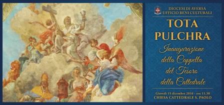 Domani, Giovedì 15 dicembre 2016 alle ore 11.30, nella Chiesa Cattedrale di Aversa, sarà inaugurata la Cappella del Tesoro delle Reliquie, chiusa per quasi un decennio per lavori di restauro architettonico e storico-artistico. “Si tratta del sacrario diocesano dove sono custodite le insigne reliquie dei santi patroni della città e diocesi”, spiega don Ernesto Rascato, Direttore dell’Ufficio Beni Culturali della diocesi di Aversa e Delegato Regionale dei Beni Culturali Ecclesiastici. Per l’occasione saranno presentati anche i lavori di restauro di quattro chiese mariane cittadine, restituite al pubblico culto grazie al contributo dei fondi otto per mille della Conferenza Episcopale italiana: Chiesa dell’Immacolata Concezione, Chiesa S. Maria delle Grazie, Chiesa S. Maria la Nova, Chiesa S. Maria della Pietà.