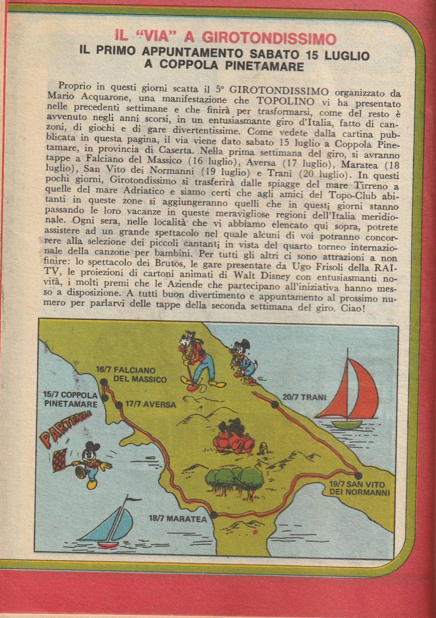 Era il 17 luglio del 1972 Aversa fu tappa di Girotondissimo, una manifestazione canora e di giochi per bambini sponsorizzata da Topolino, qui la notizia riportata nell’edizione 16 luglio 1972 dele fumetto.